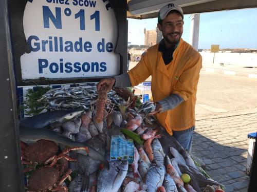 エッサウィラでのディナーは、海辺の海鮮屋台でいただきました!旧市街を出て漁港に向う途中にずらりと屋台が並んでいるので、すぐ... 続きを読むにわかると思います。お店の入口には、各シーフードのキロ単位の値段が書かれているのですが、これはあくまで目安。実際に目の前で好きなお魚類を選ぶと、おじさんが全部でいくら...という風に値段を出してくれます。その値段を聞いて、納得すれば初めて席に通されます。私達が選んだのは、タイ、いか、えび。値段は、シーフードの代金と調理代+サラダ+パン、全て込みで250DH(2500円)。調理法も炭火焼オンリーなので、素材そのものの美味しさを堪能できます! 閉じる