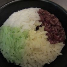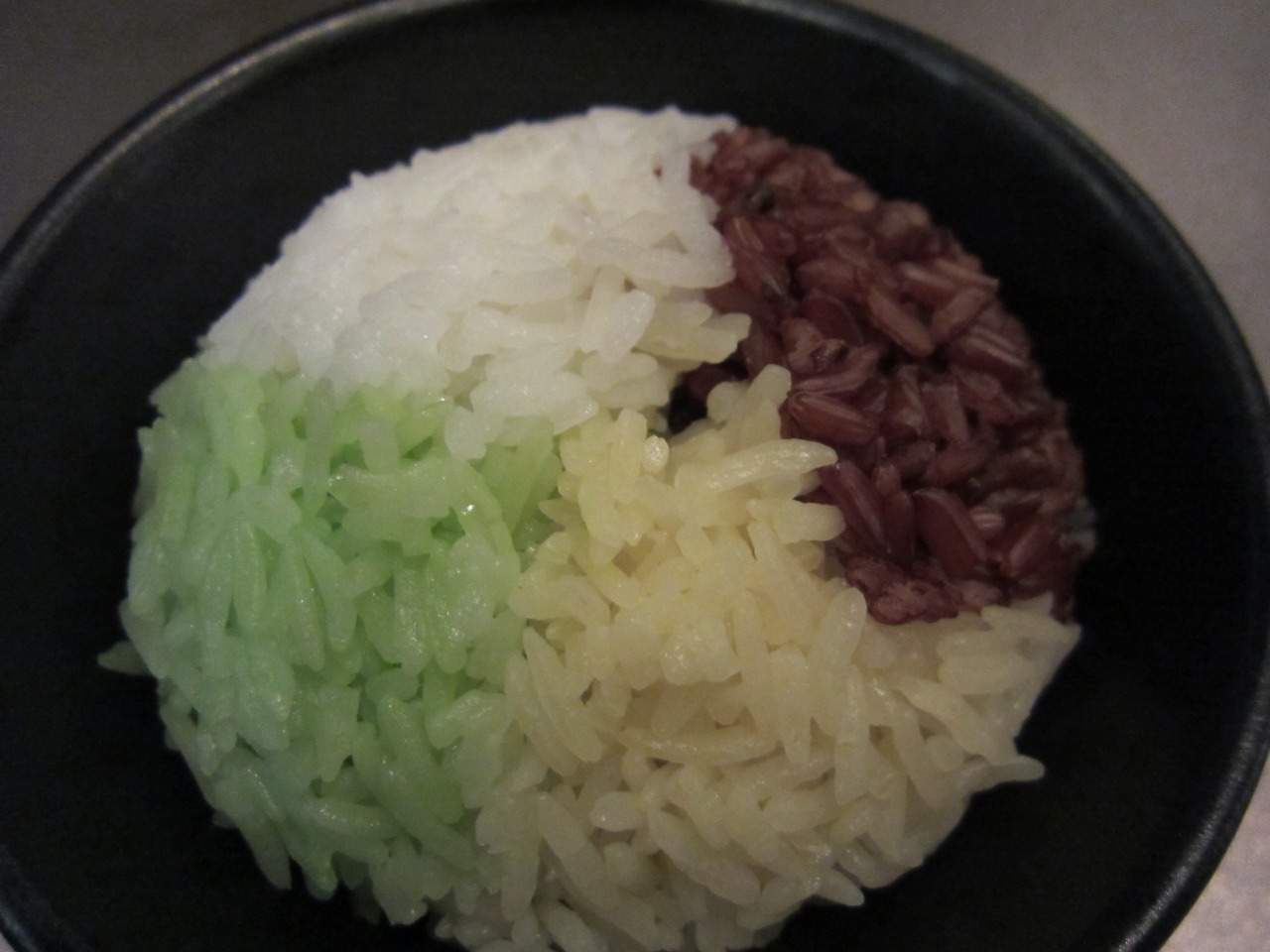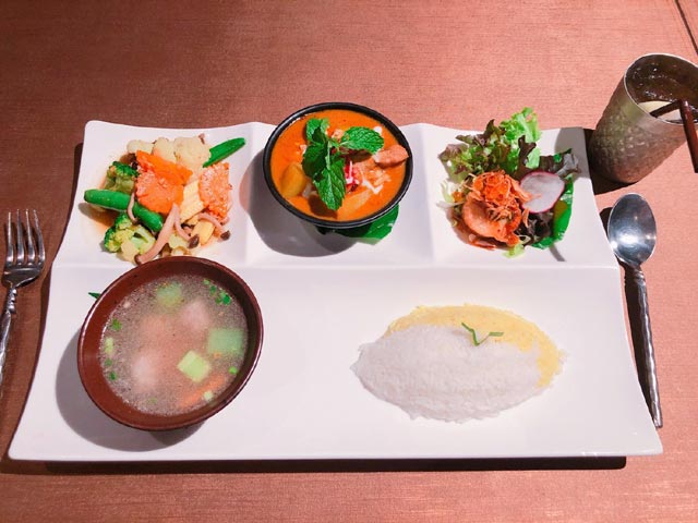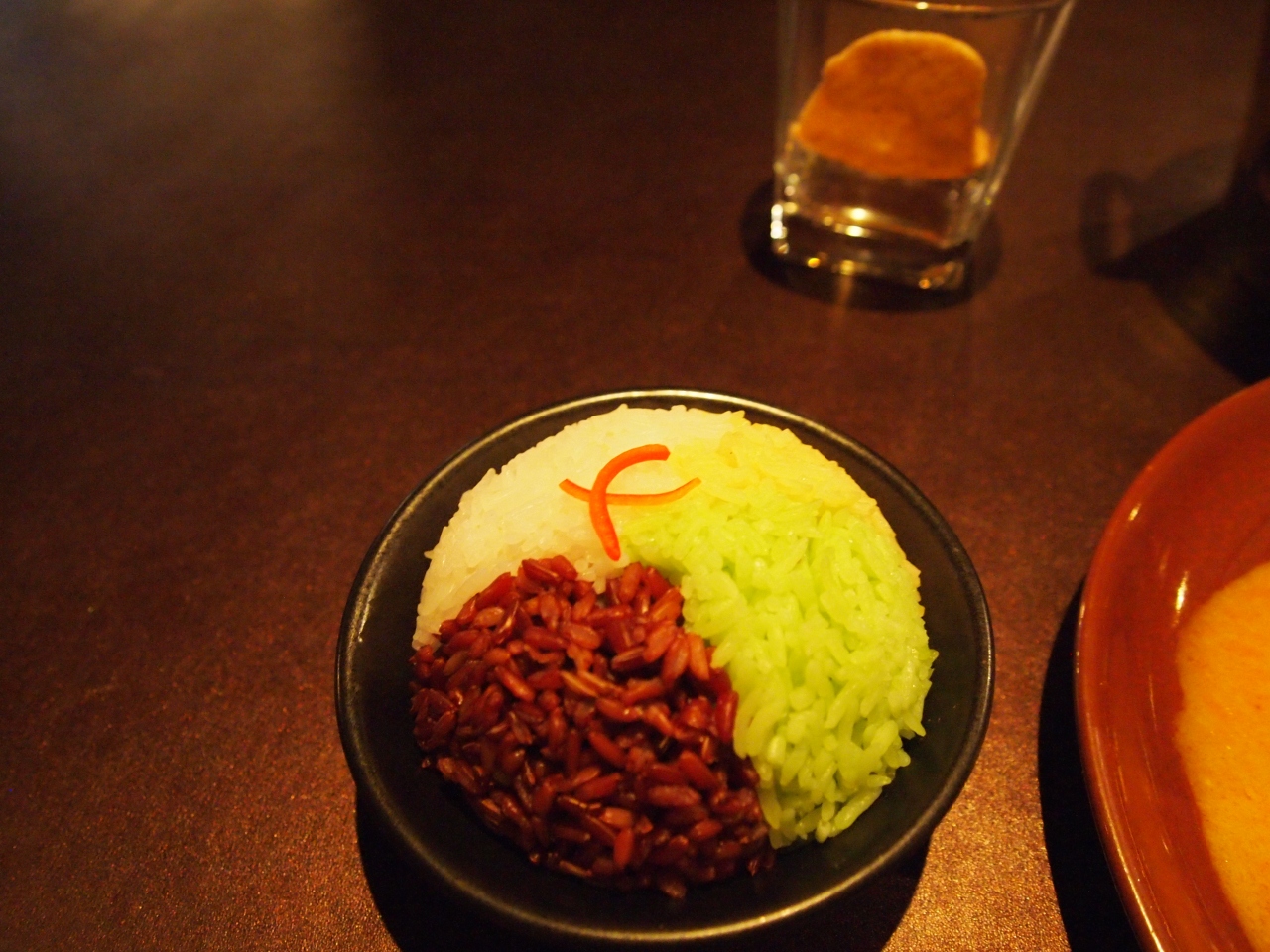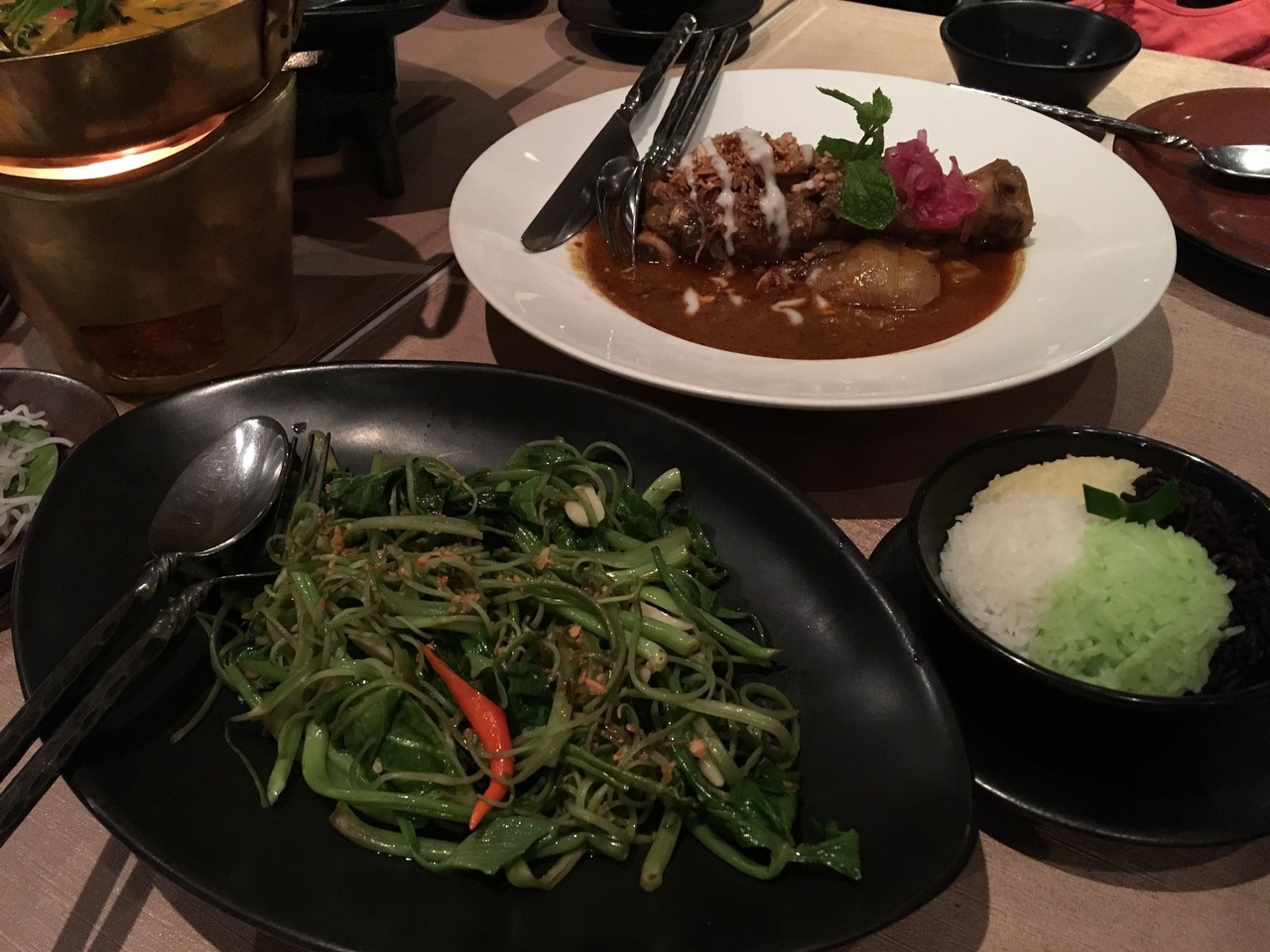 空心菜の炒め物、マッサマンカレー、カラフルなお米