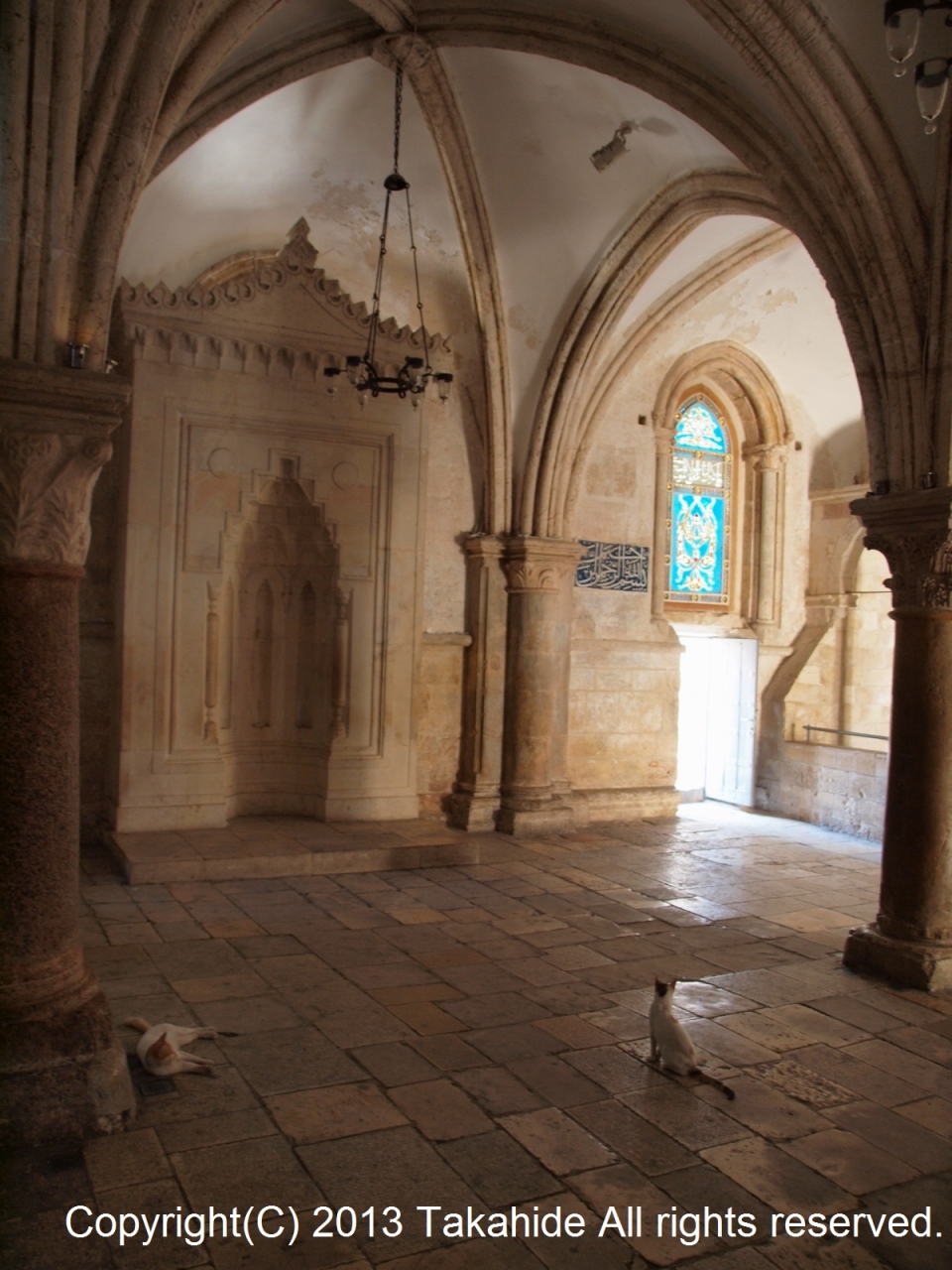 1階がダビデ王の墓で、外階段で2階に昇ると、最後の晩餐の部屋と呼ばれる場所です。イエスが十二使徒と共に過越祭の食事を取った場所です。食事の際、イエスは、この後起こることを予言したとのこと。食事後ゲッセマネの園にお祈りに行き、捕まり、十字架に磔にされます。