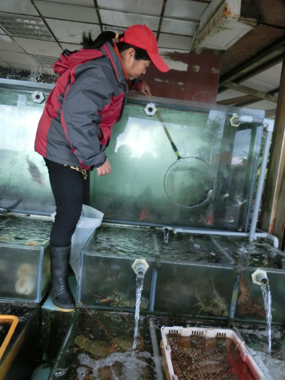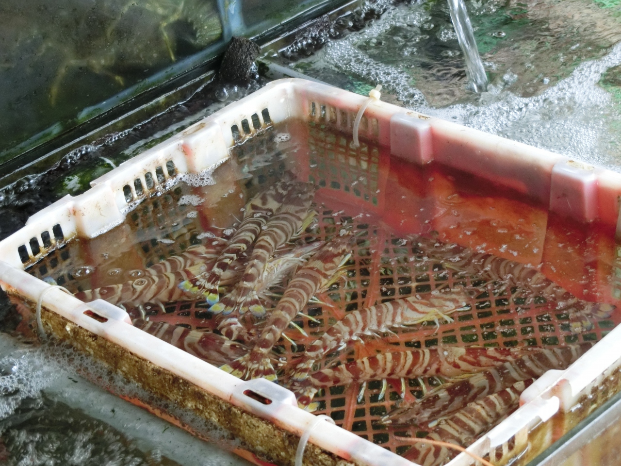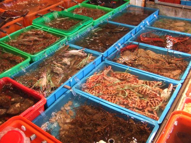 高級食材である、伊勢海老、カニ類数種、ナマコが多く並らんでいました。