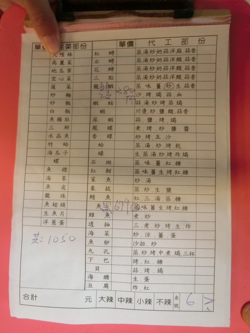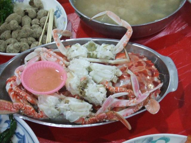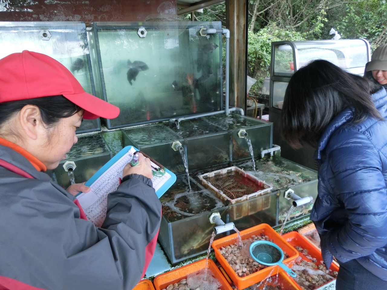 海鮮店で買った蟹、蝦、蝦蛄、貝、魚などを代客料理店に料理してもらい、