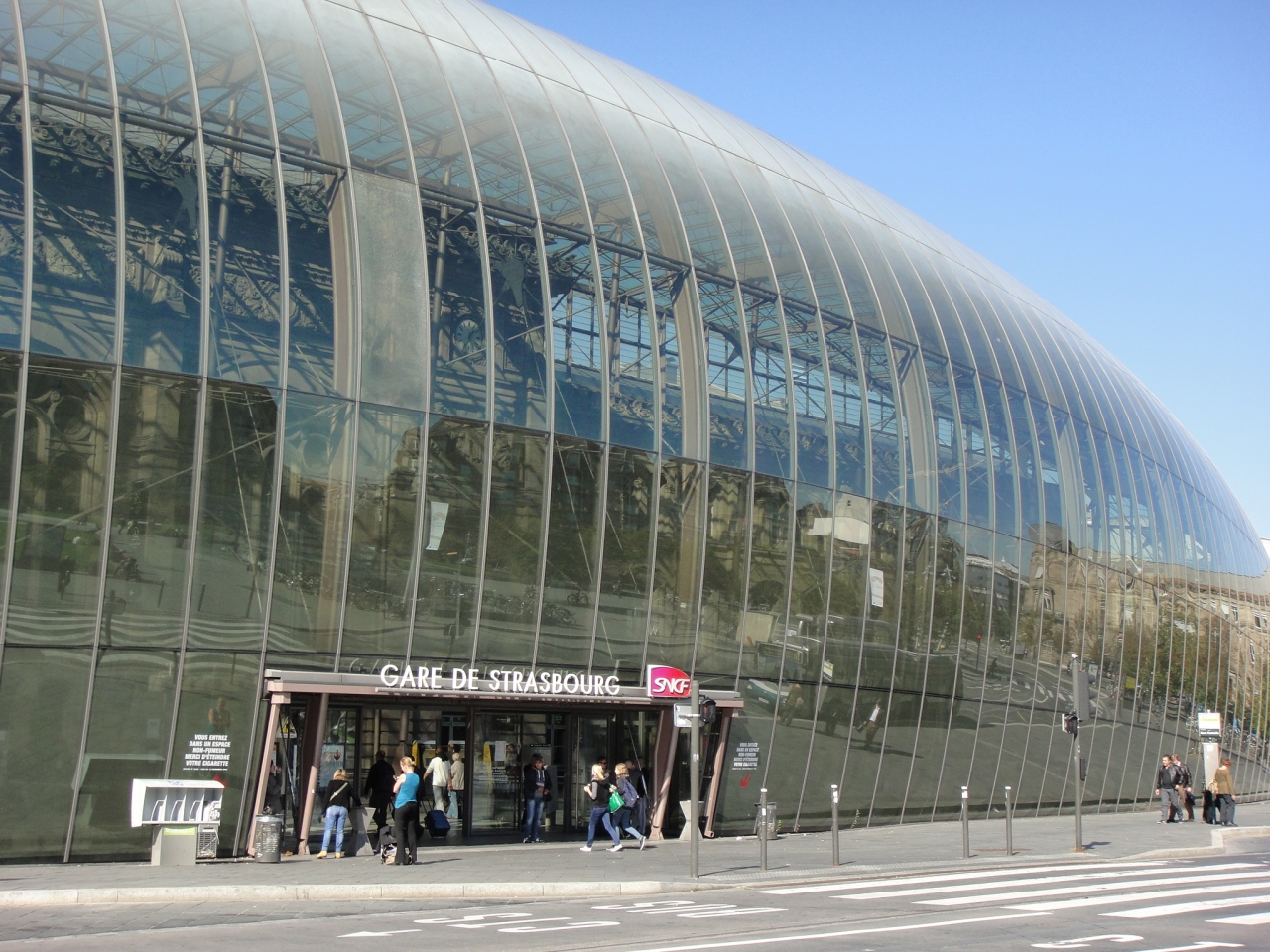 ストラスブール駅の駅舎は、石造り建造物が巨大なガラス張りドームで覆われています。古き良き時代の建物とモダンなドームが上手に融合され、利便性と伝統の調和が感じられます。ストラスブール駅舎は、2007年に全面改築されたそうです。駅前広場から振り返って眺めたストラスブール駅の外見は、巨大なガラスドームですが、内側にはしっかりと伝統的な石造建屋とプラットフォームが残されています。