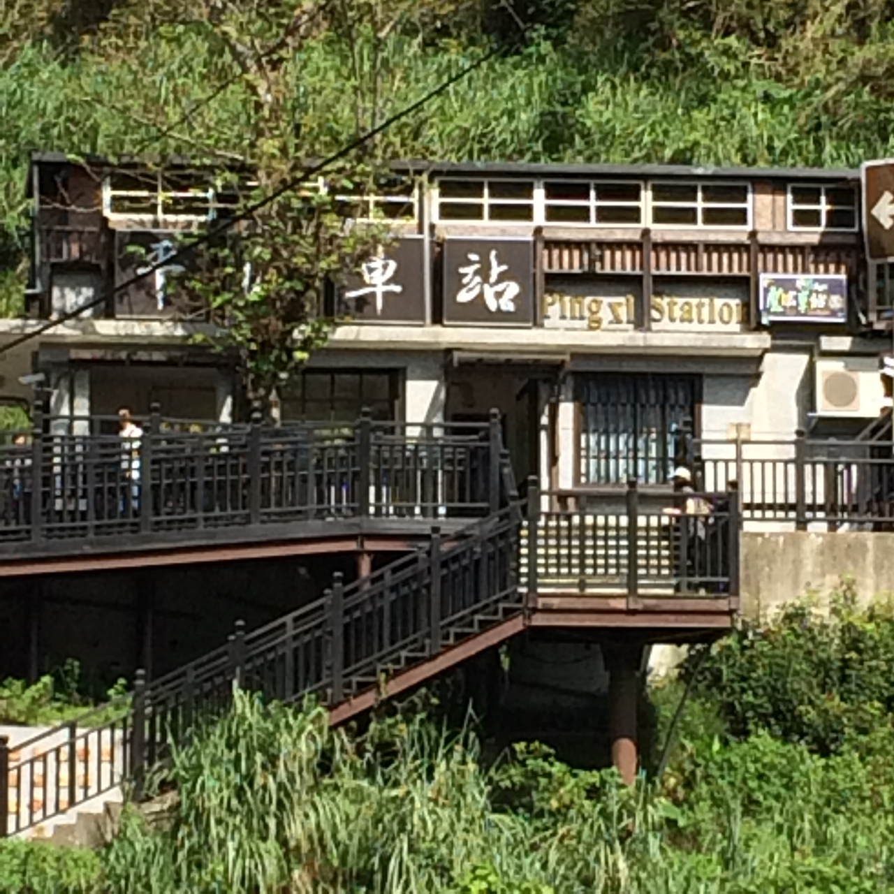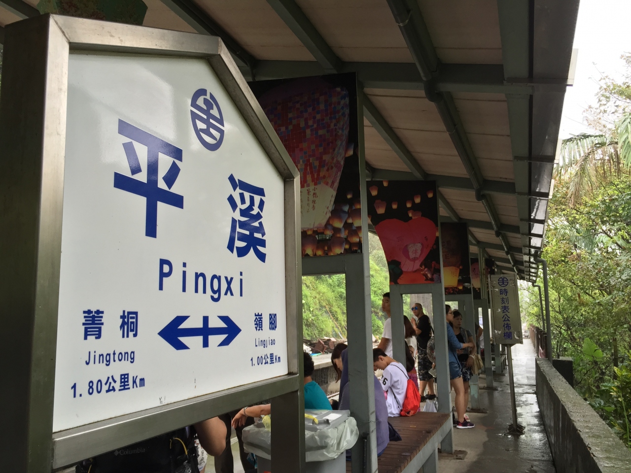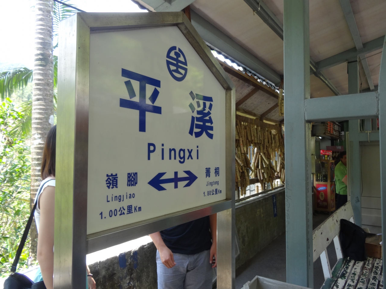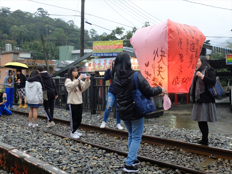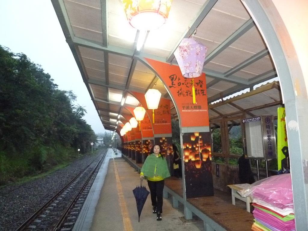 駅舎自体は味気ない雰囲気。列車発着の合間には天燈(天灯)上げで賑わいます。