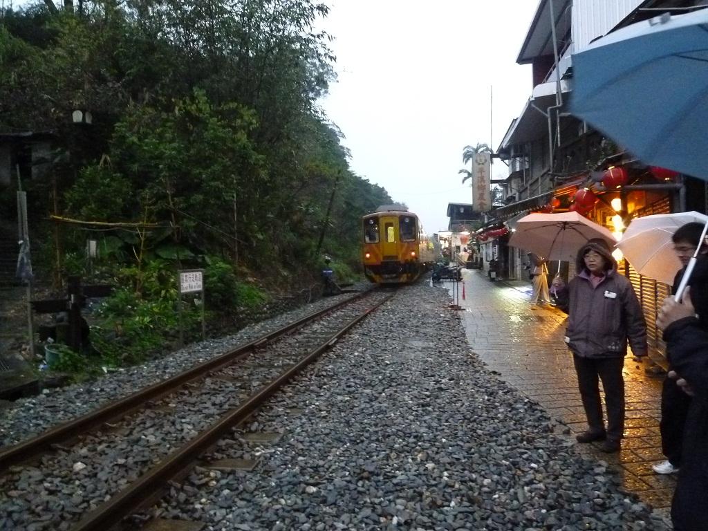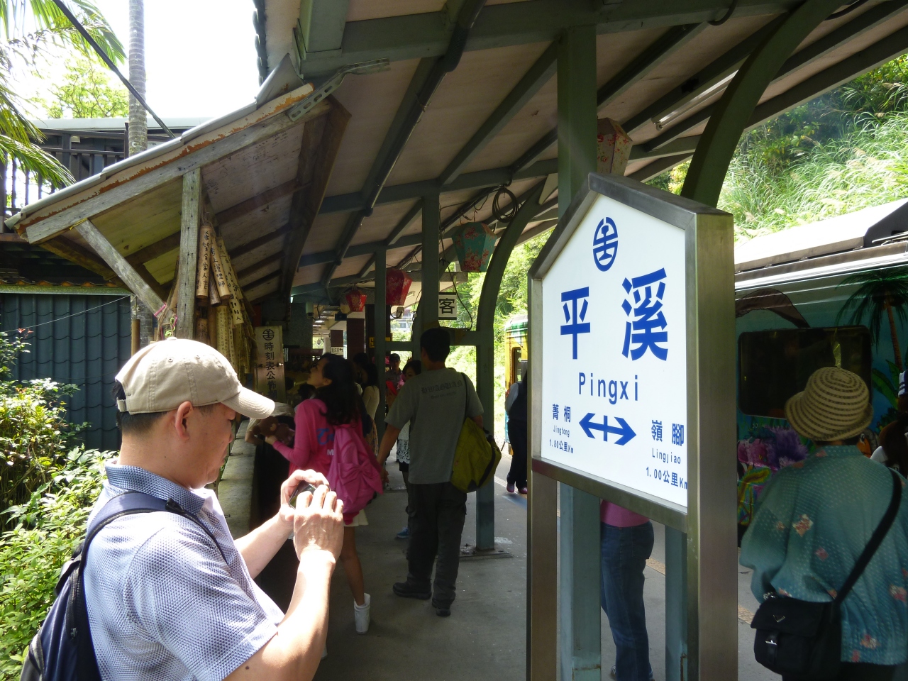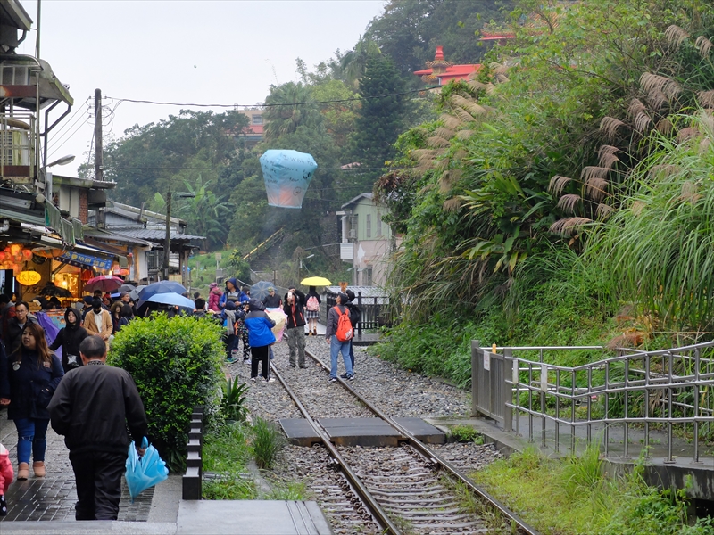 平渓駅は、駅舎も駅前の雰囲気も菁桐駅と比べると味気ないんですが、天燈(天灯)のお店がたくさん並んでいて、列車の発着の合間の時間帯には線路に入って天燈(天灯)上げに興じる人が多数。