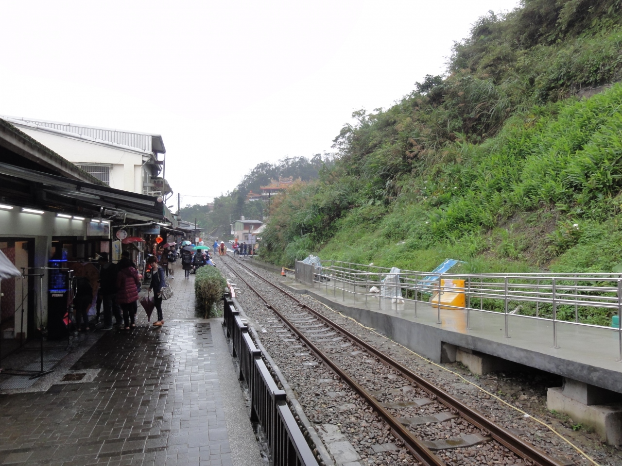 平渓駅の石畳のプラットフォームには段差がない所もあり、砂利の敷かれた線路に