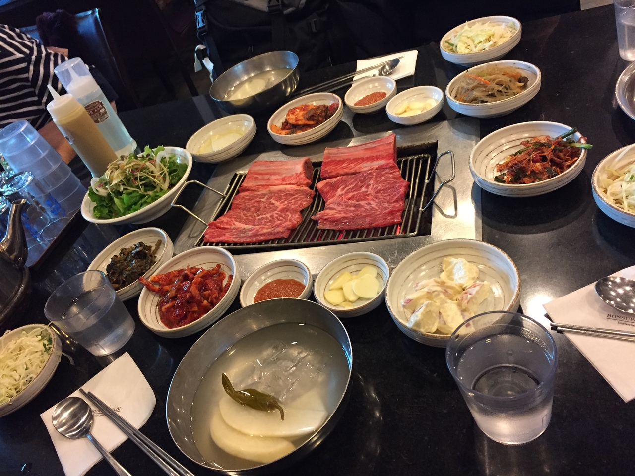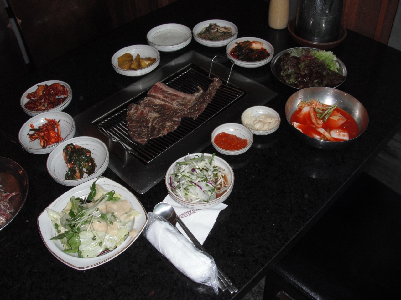 その間にキムチやケジャン、大根のムルキムチ?玉ねぎの味付けなど、おかずのセットが