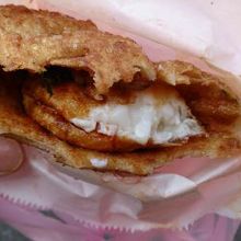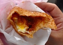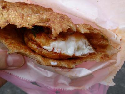 この食べ物、いったい何だろう。油、餅、その前にタマゴとかネギとかいった漢字の文字がある。百聞は一見にしかず、ではなく一食に... 続きを読むしかずで、まずは食べてみたいと思って行ってみた。友人に教わったその場所には、2軒が並んで同じものを売っているではないか。もともと移動販売をしていたのか、軽トラックの荷台が調理場になっている。トラックの色が片方は黄色で、片方は青。2軒で競争、いや向上し合っているのだろう。黄色いのがこの店で、番地が102号になっている。卵付きかどうかで値段が違っていて、両方の店とも30元(約110円)、20元(約80元)。せっかくだから卵付きを頼んだ。近くの路地に座ってほおばると、うまいではないか。薄べったく平らに揚げた生地の中にネギが刻み込まれ、ポーチドエッグのように油の中で揚げた卵がはさまれていた。一緒にかぶりつくのである。ネギの芳ばしさ、熱々のかぶりつき。これでまずいはずはない。 閉じる