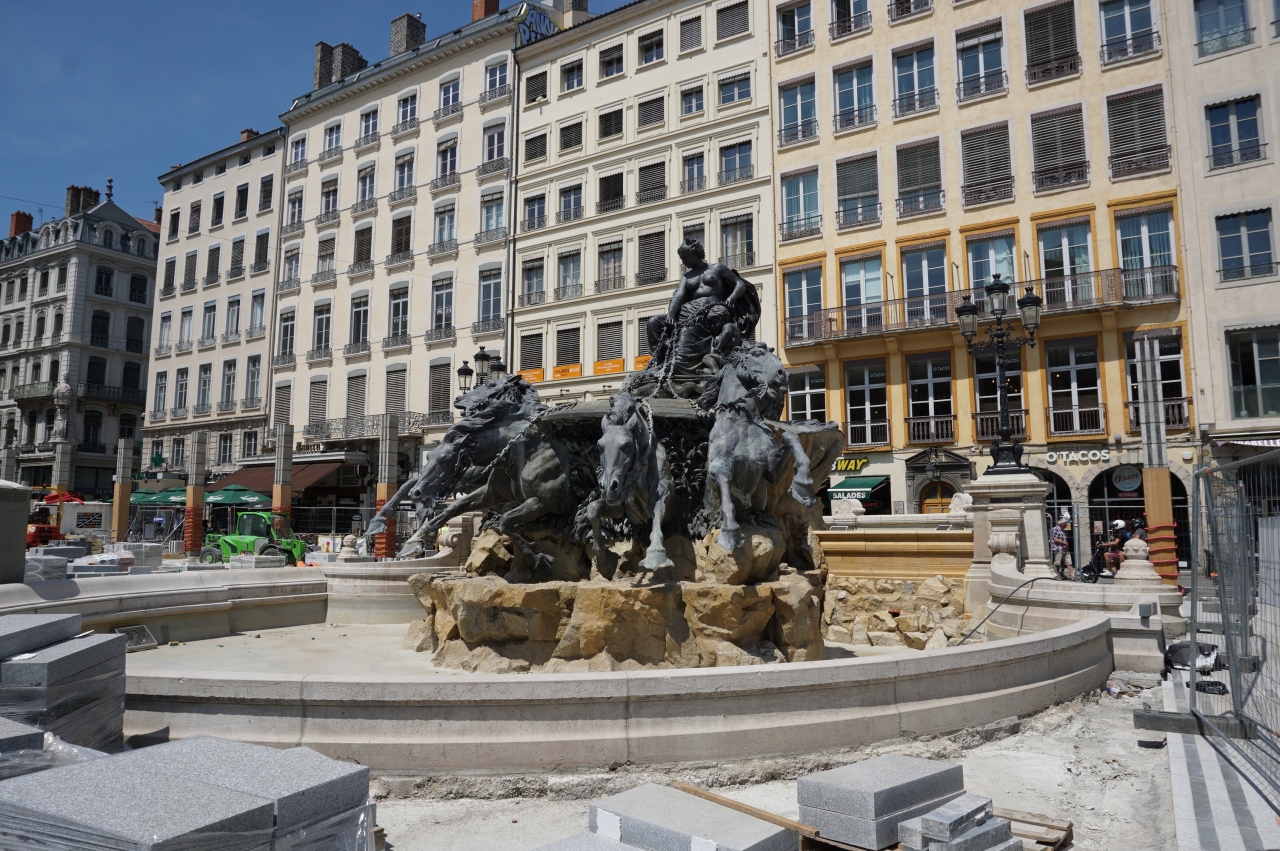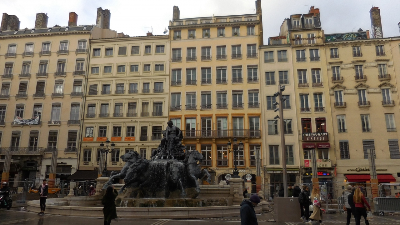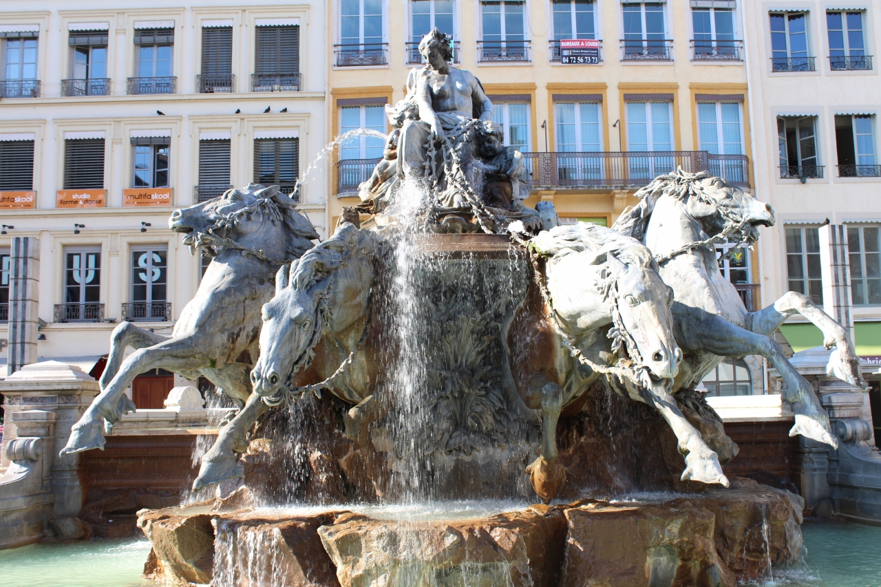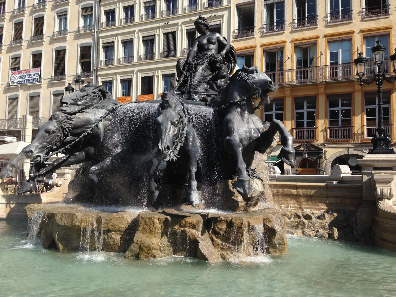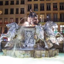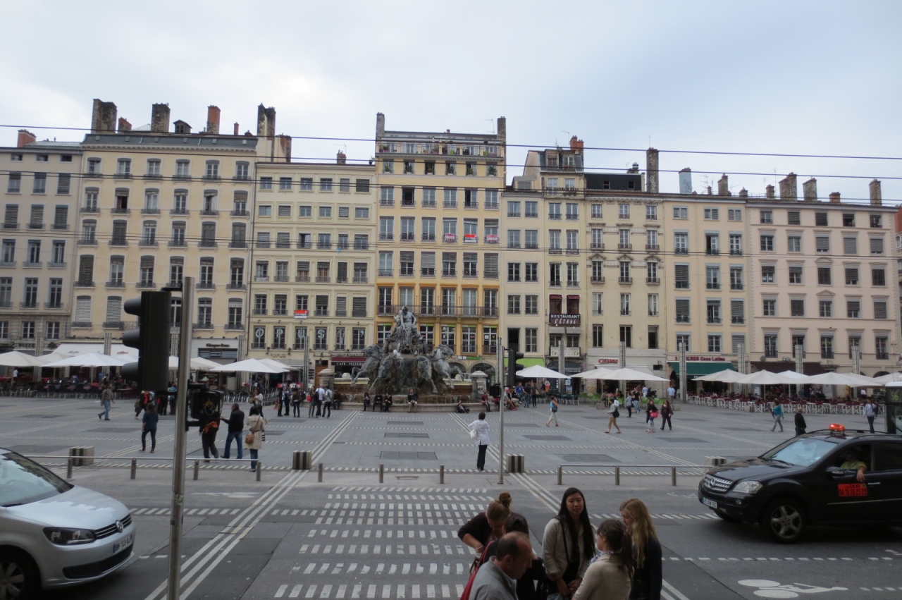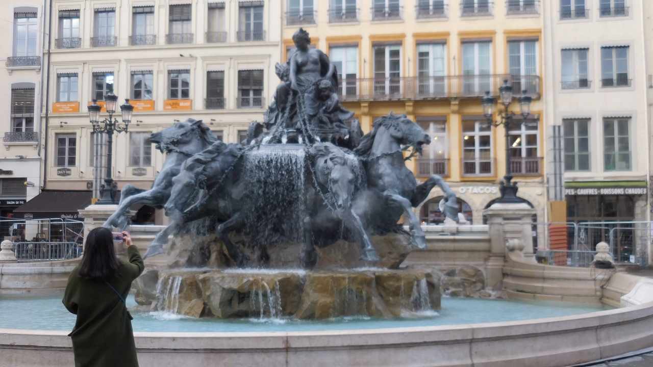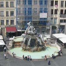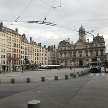 バトルディーの泉がある大きな広場、市庁舎やリヨン美術館が面しています