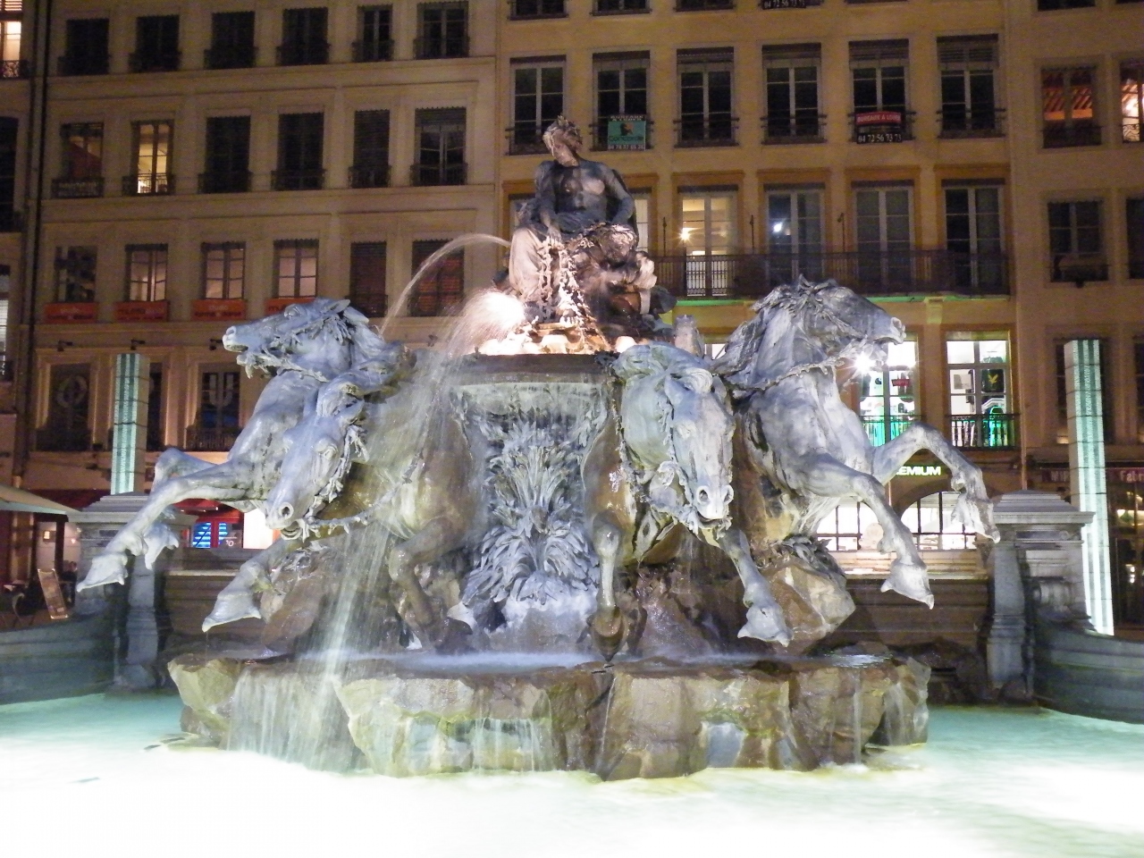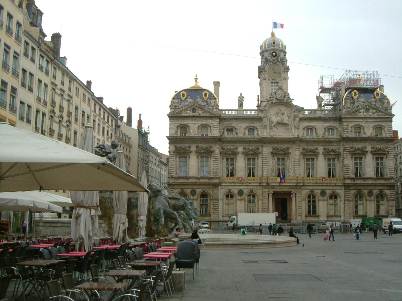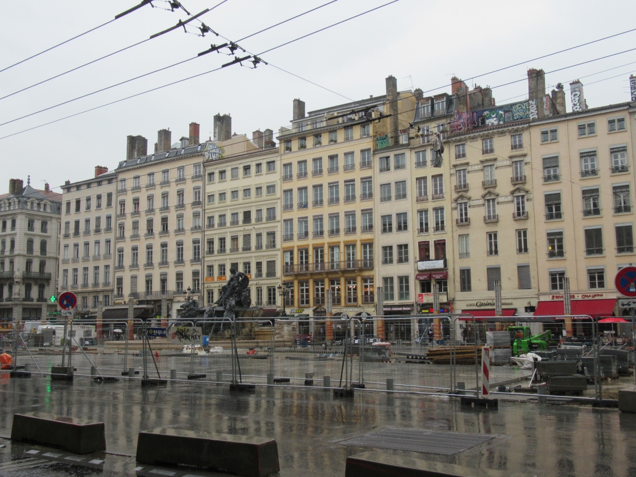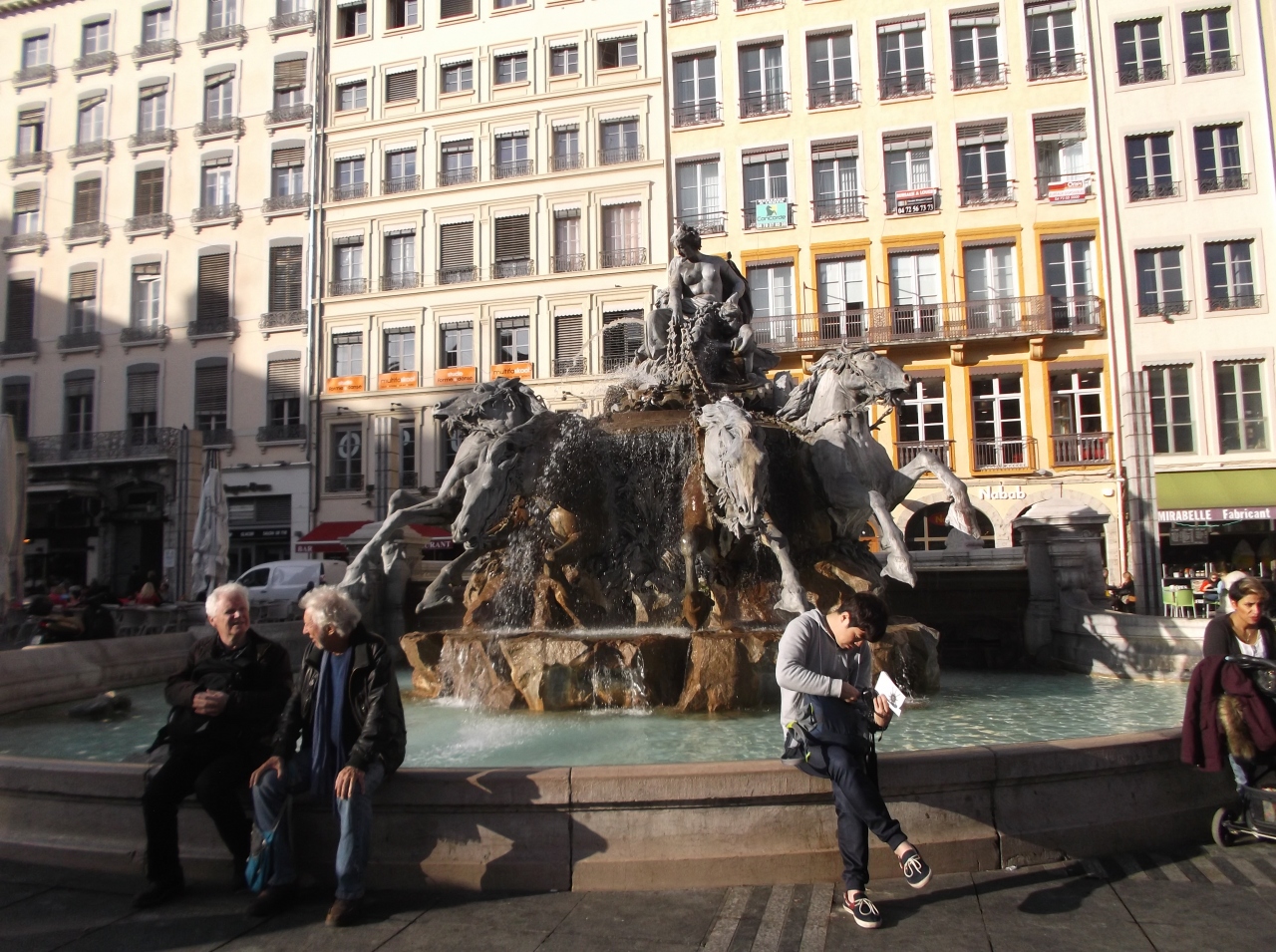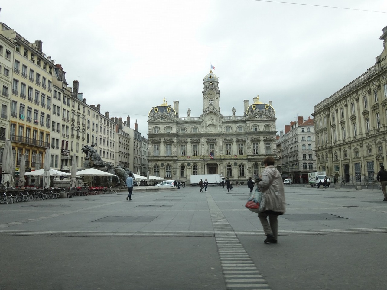 バトルディーの泉がある大きな広場、市庁舎やリヨン美術館が面しています