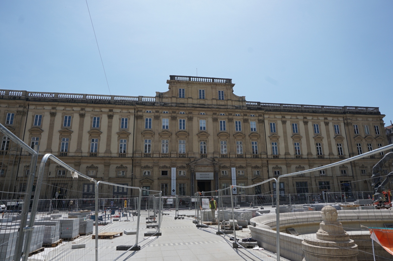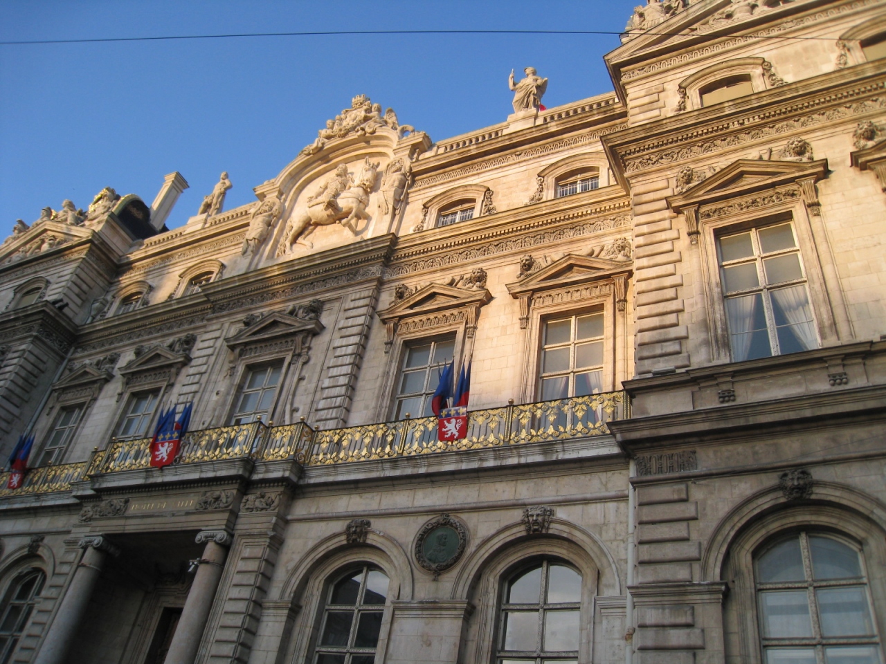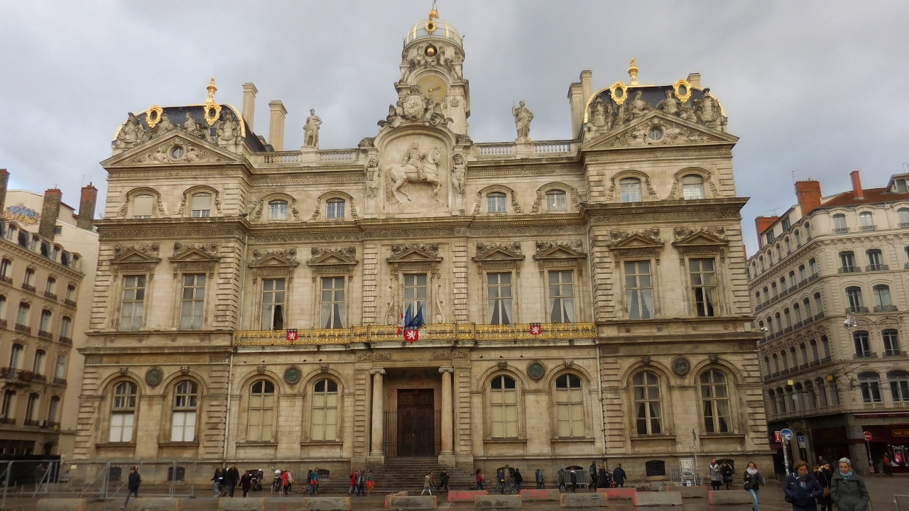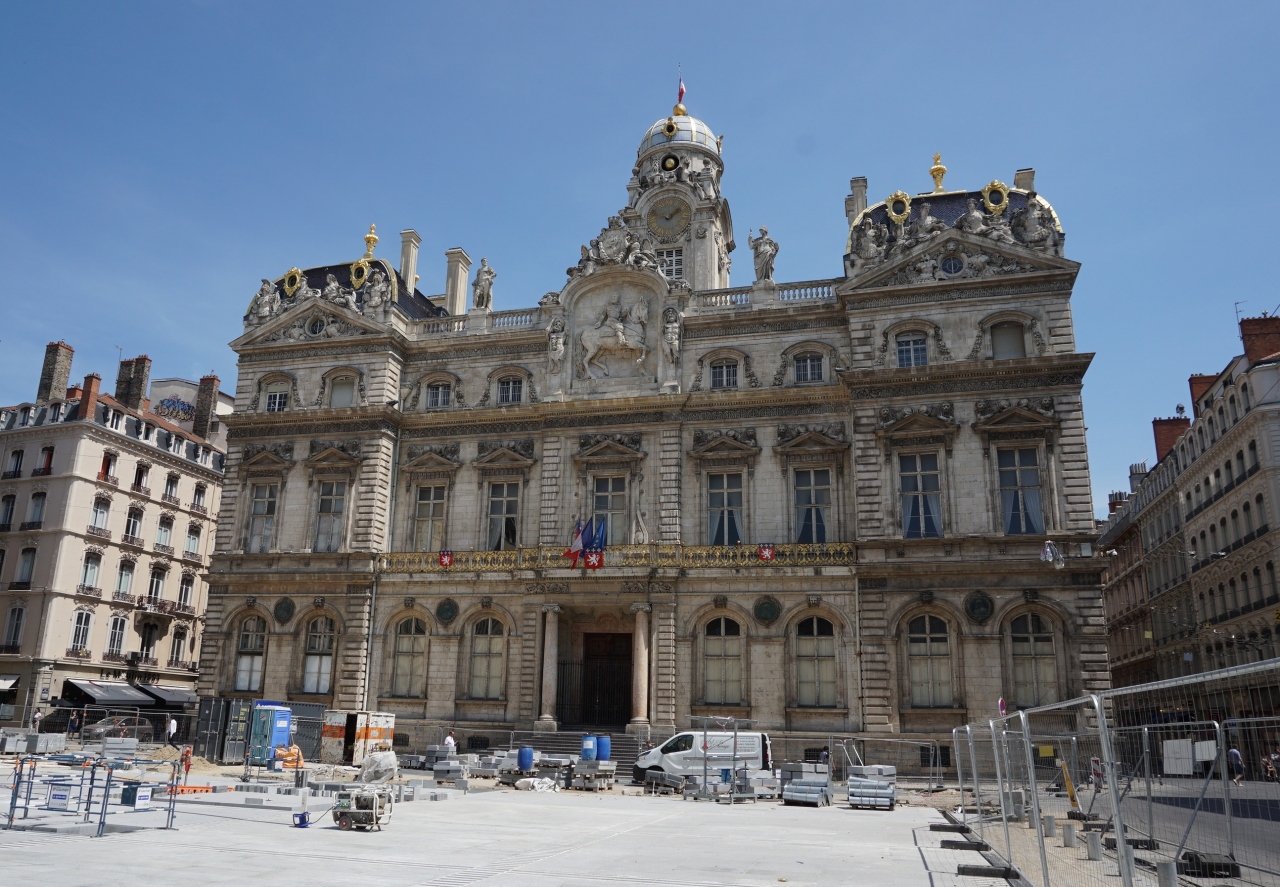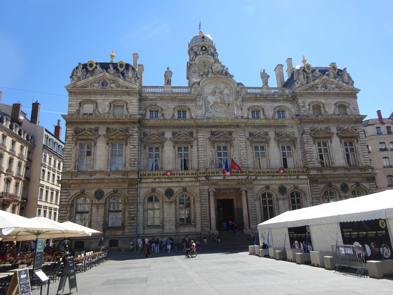 バトルディーの泉がある大きな広場、市庁舎やリヨン美術館が面しています