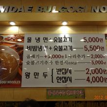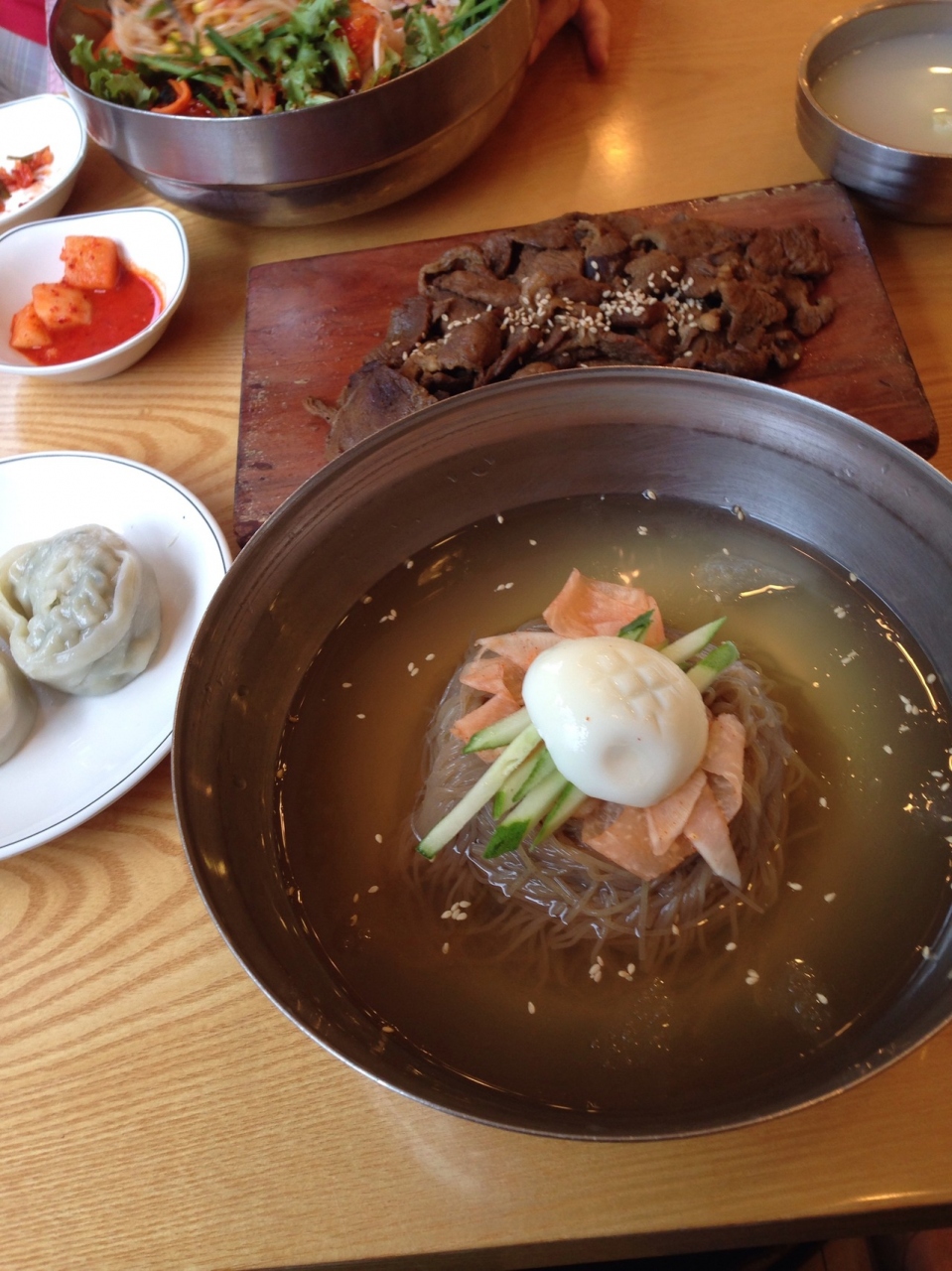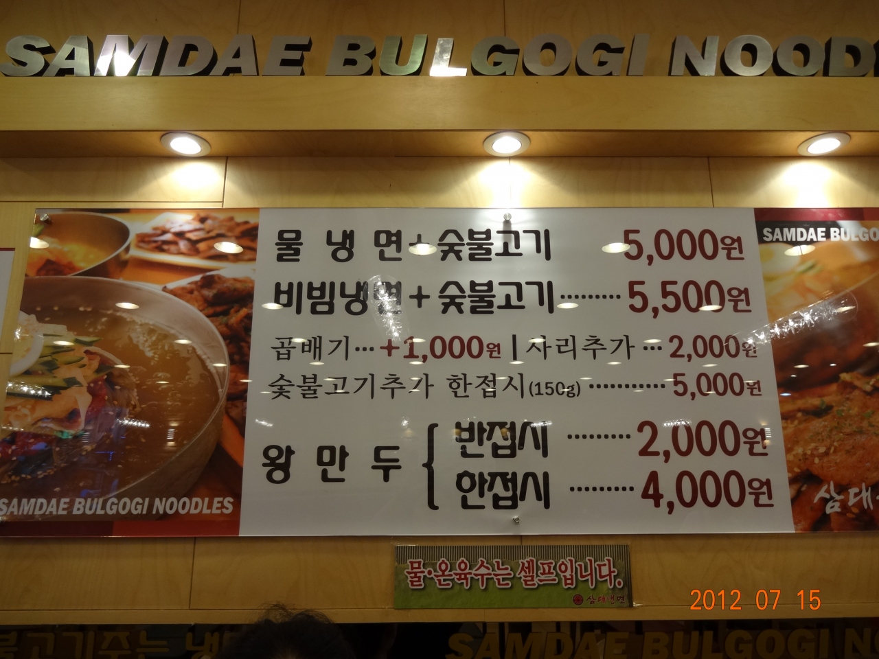 冷麺・カルビのセットが5,000ウォンで、350円くらいです。おすすめは辛い冷麺(500ウォン増し)のほうのセットかな。