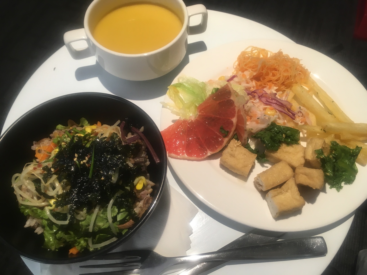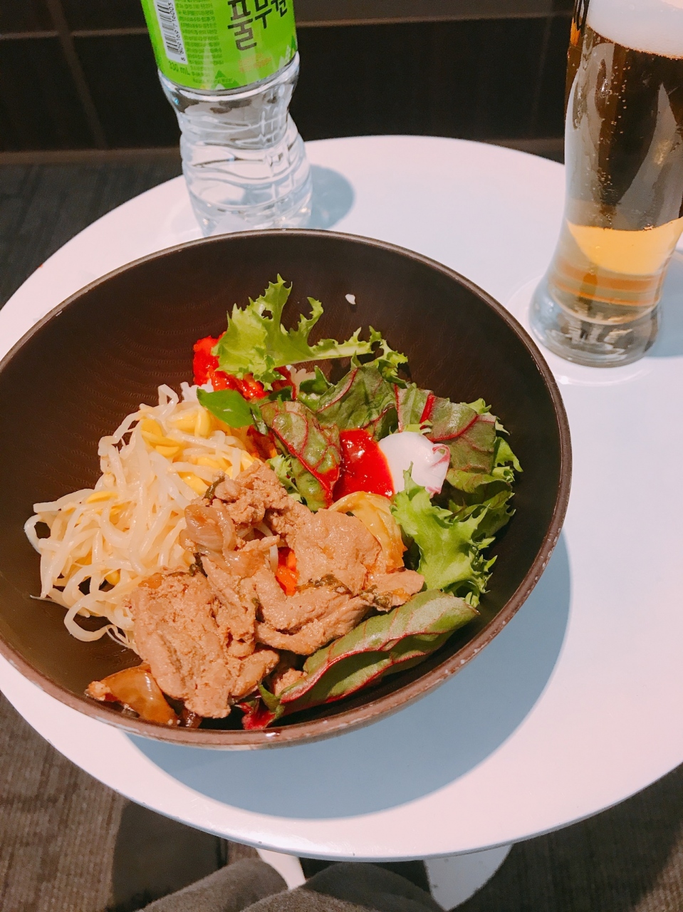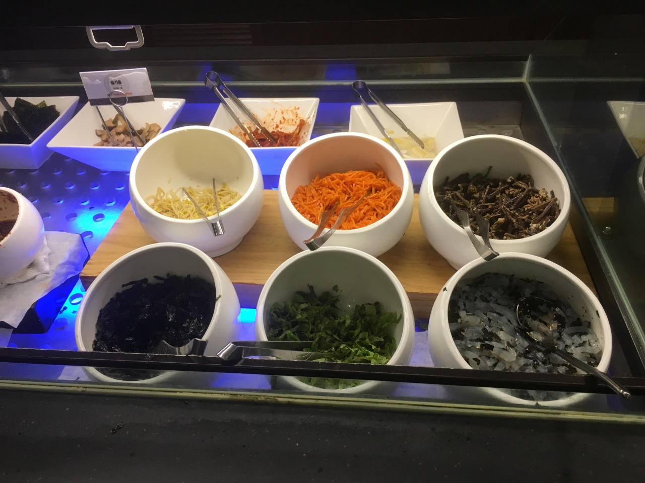 食事はそこそこ種類がありました。野菜が多いと思って一瞬感激したのですが、ビビンバ用のもので、味付けが濃く、油こっかったです。サラダ用の生野菜も用意してほしかったです。
