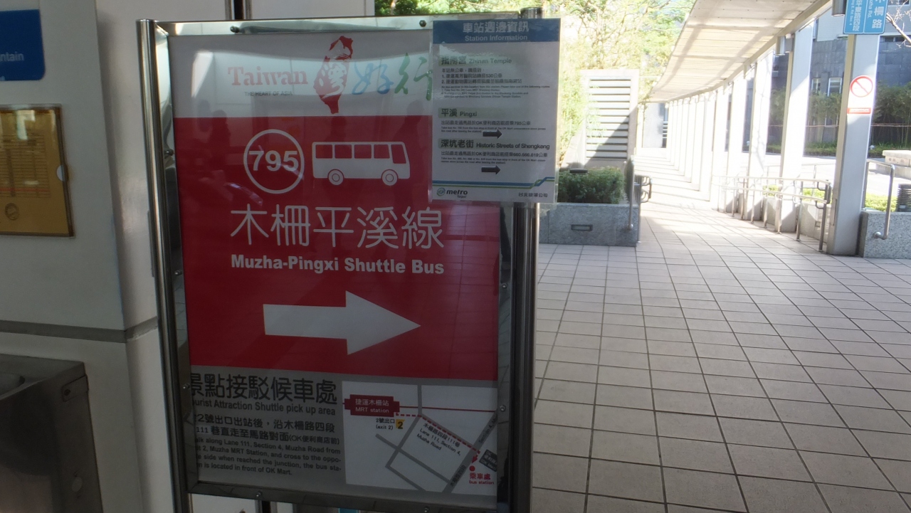 駅を出て出口を南... 続きを読む東にちょっと歩くと大きな通り(木柵路)に出る。すぐにバス停があるはず。深抗や平渓など東側へ向かうバスは、通りを渡って向かい側のバス停に行く必要がある。