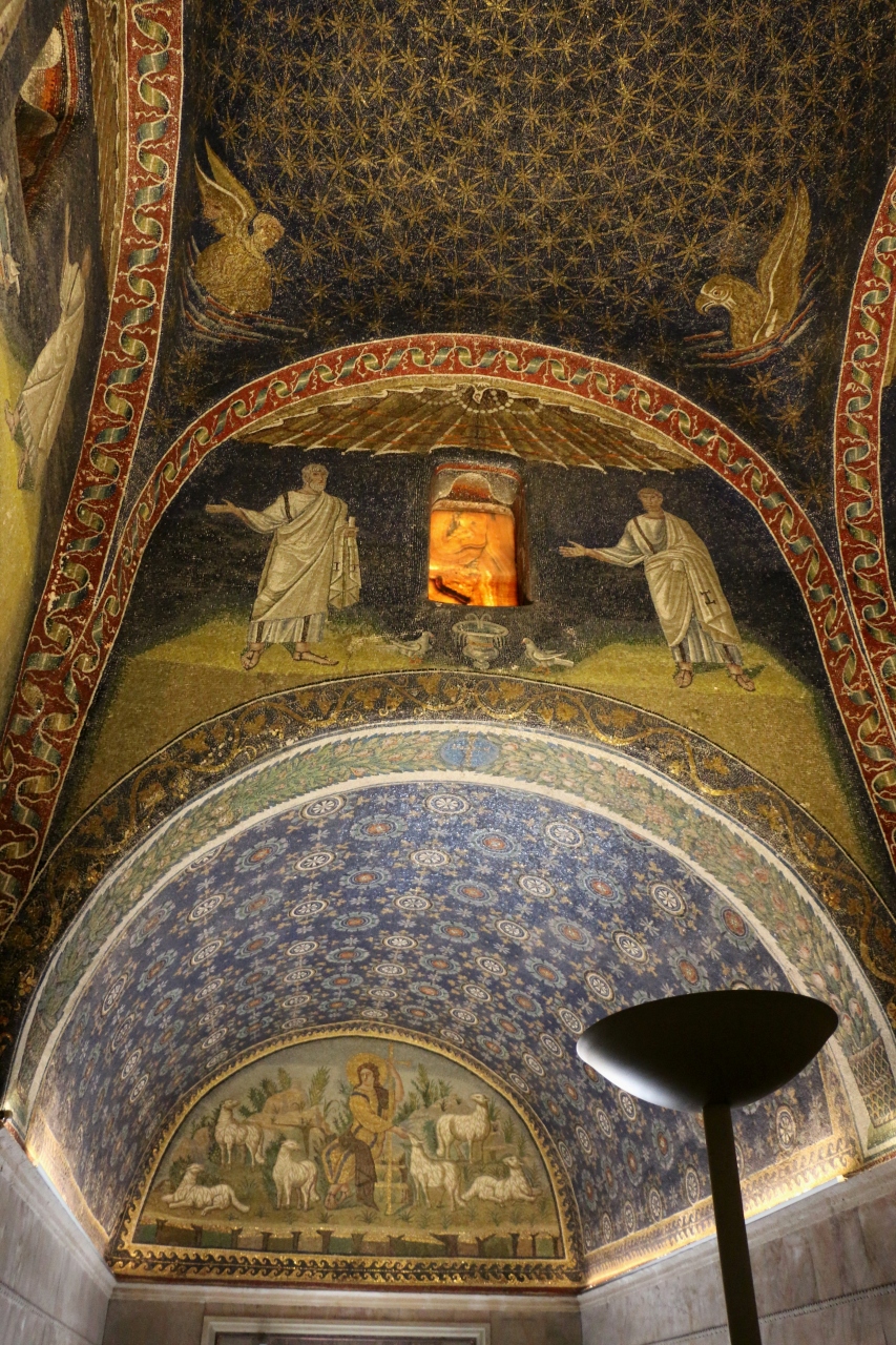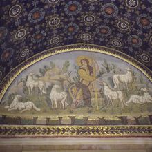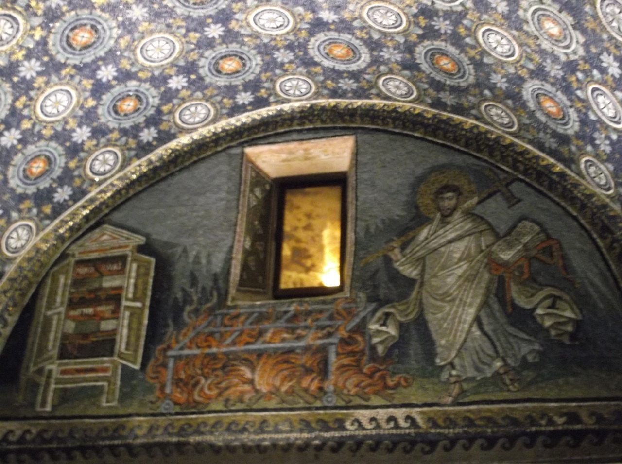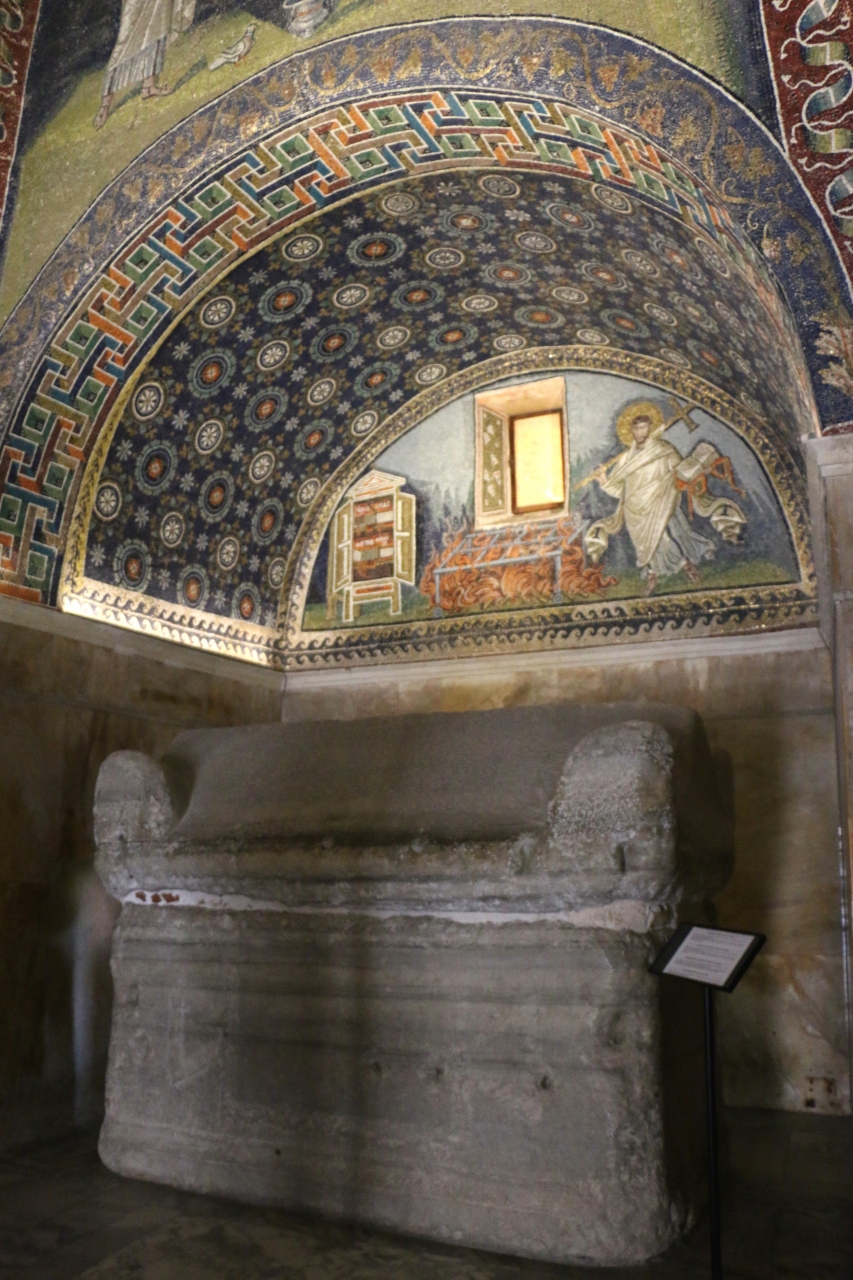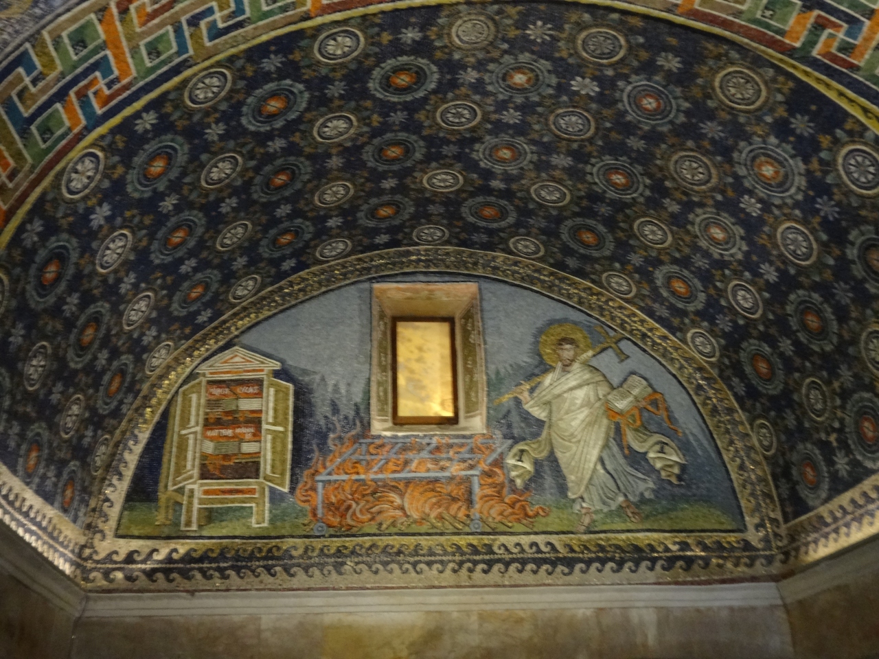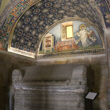 聖ラウレンティウス(サン・ロレンツォ)に奉献された礼拝堂だったが、ラヴェンナでモザイクガラスの実現に力を捧げたガッラ・プラキディアの、ラベンナに対する献身が高く評価されて、死後に遺体がこの廟に祭られた為に「墓廟」の名称がつけられたそうです。