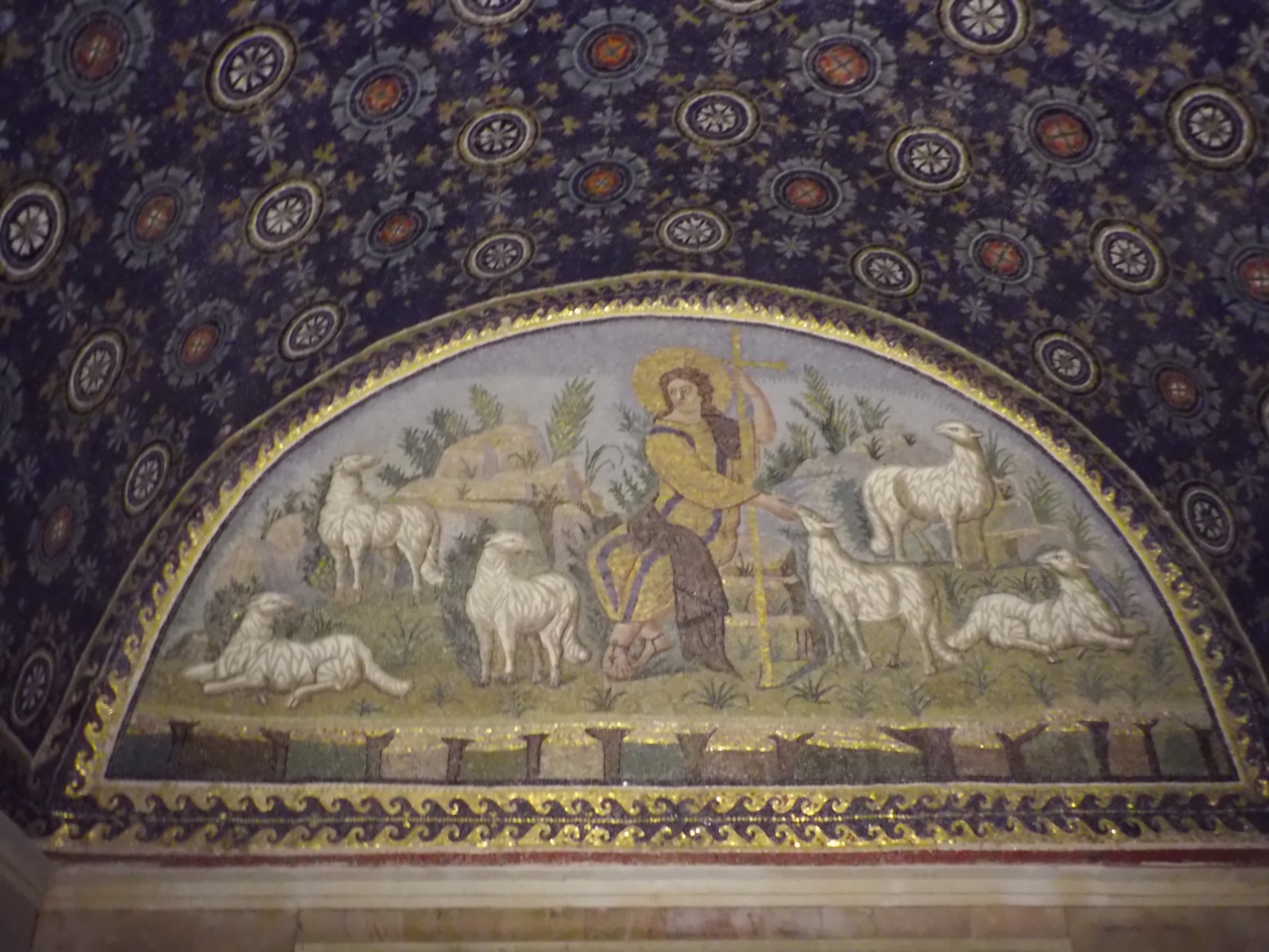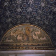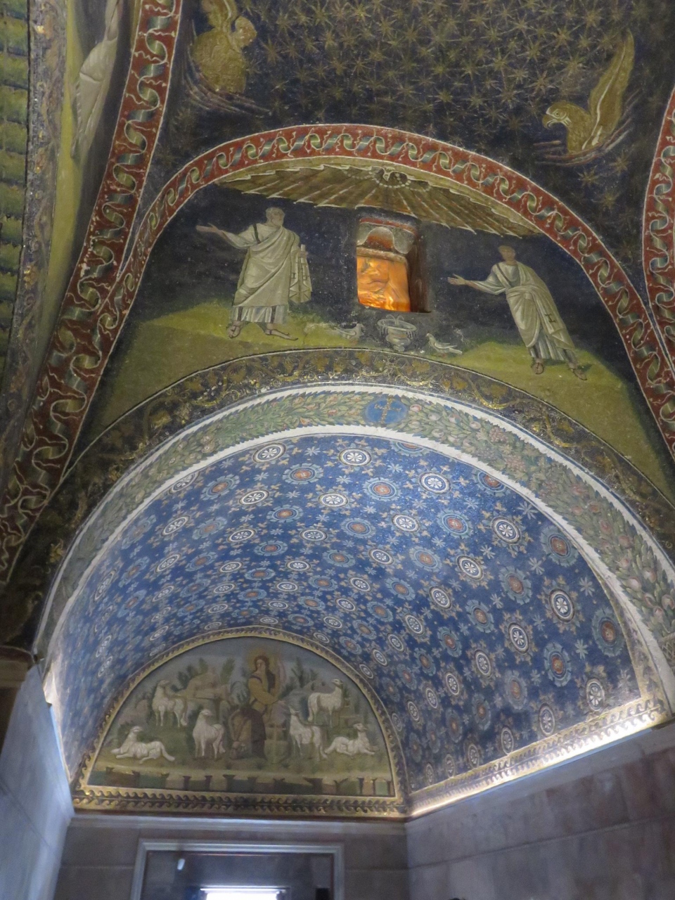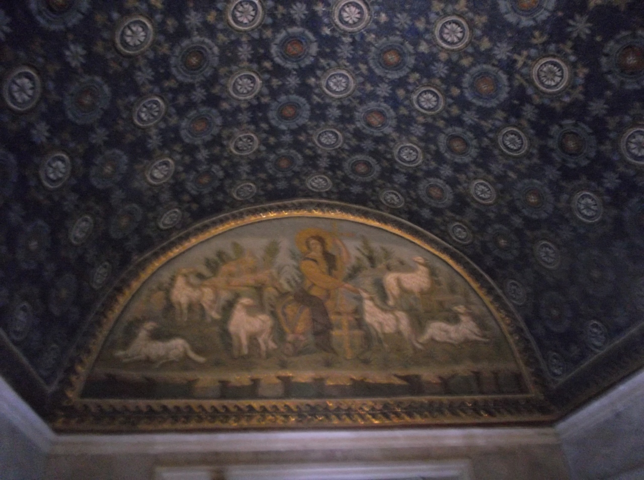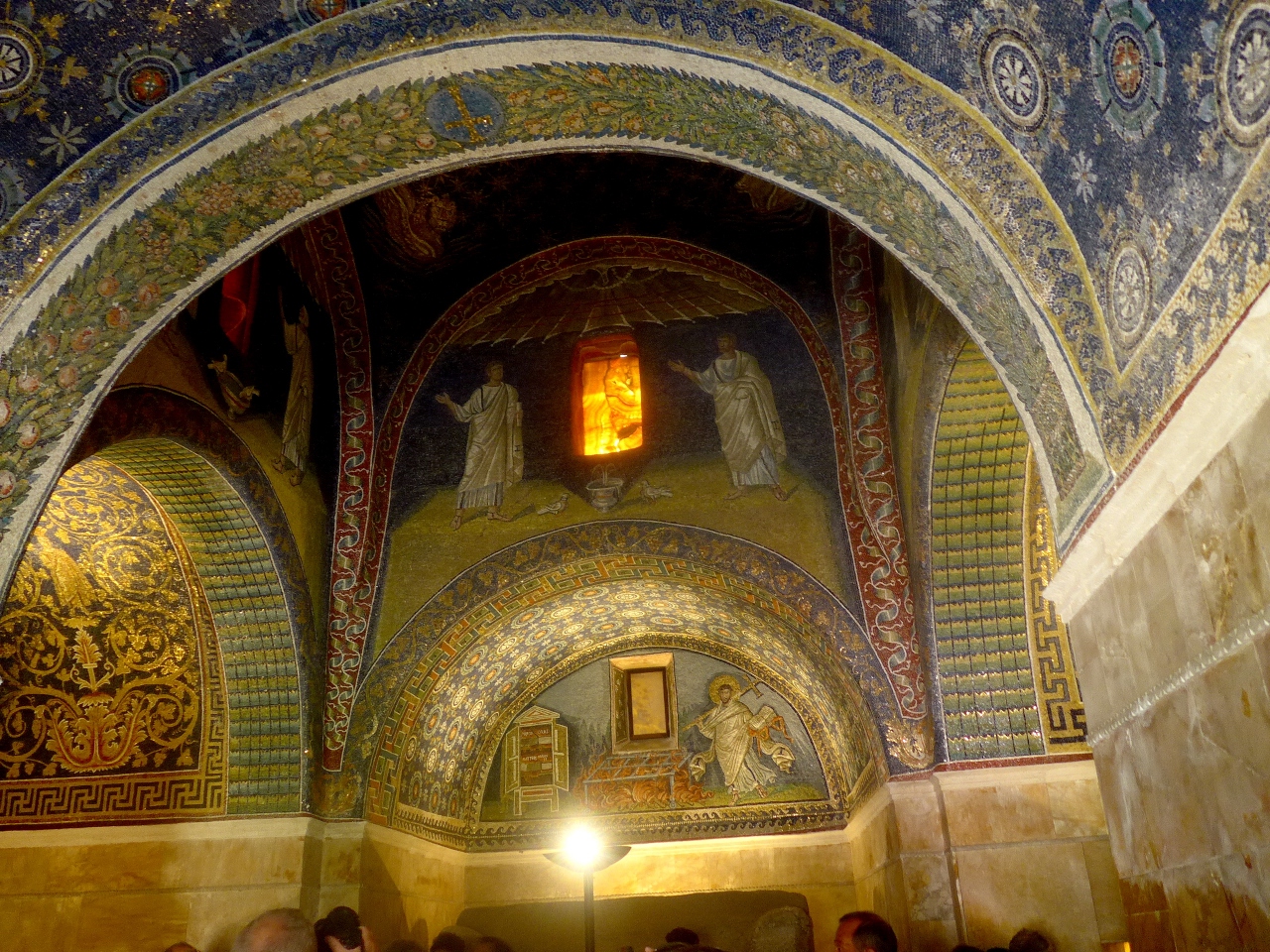 聖ラウレンティウス(サン・ロレンツォ)に奉献された礼拝堂だったが、ラヴェンナでモザイクガラスの実現に力を捧げたガッラ・プラキディアの、ラベンナに対する献身が高く評価されて、死後に遺体がこの廟に祭られた為に「墓廟」の名称がつけられたそうです。