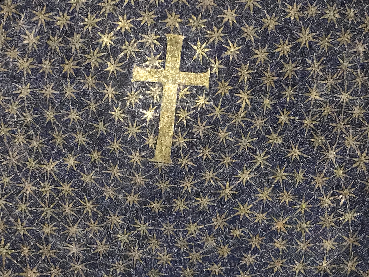 そして、天井を見上げますと青色に金色の星・金の十字架・、周りに使徒を模した動物の画。