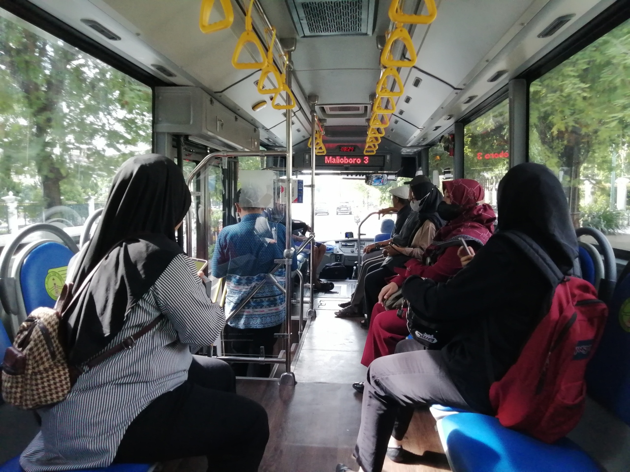 続きを読むになれた料金徴収係が駐在している。どこに行きたいとか伝えておけば、乗るべき番号のバスが来たときに声を掛けてくれる。朝早くから運行しており、マリオボロ通りから朝5時20分頃に3Aに乗車した。