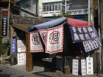 客家料理店や土産物やが並ぶ、勝興駅前の老街