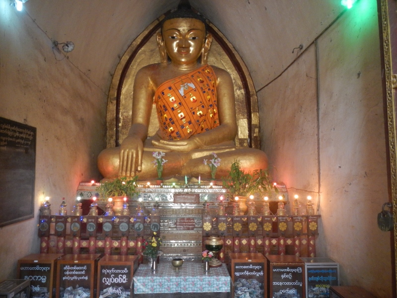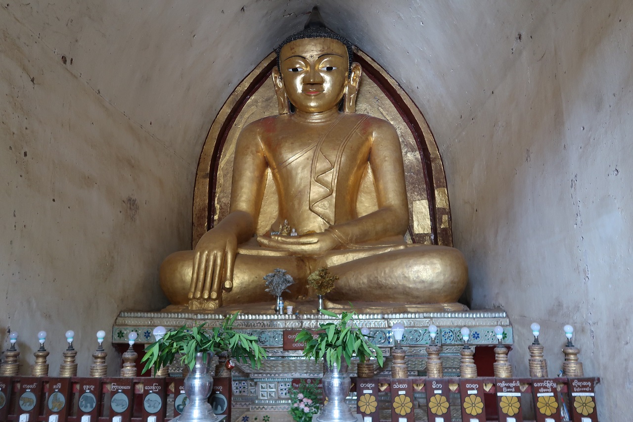 ゴープラムを思わせる形状をした高さ43mの仏塔が目を惹くバガンでも珍しいスタイルで、外壁の仏像たちはマンションのように1体1室ずつに納められており、堂内には1体の大きな仏像が、物憂げな表情で見据えていて迫力を感じます。