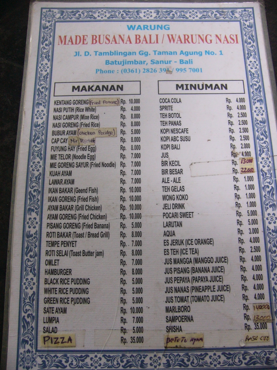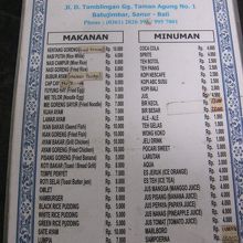 ちなみにナシ チャンプル(Rp.8,000)、ナシ ゴレン(Rp.8,000)、ミー ゴレン(Rp.7,000)、イカン バカール(Rp.10,000)、フレッシュマンゴージュース(Rp.4,000)って感じで、Rp.10,000を超えるメニューはほとんどありません♪