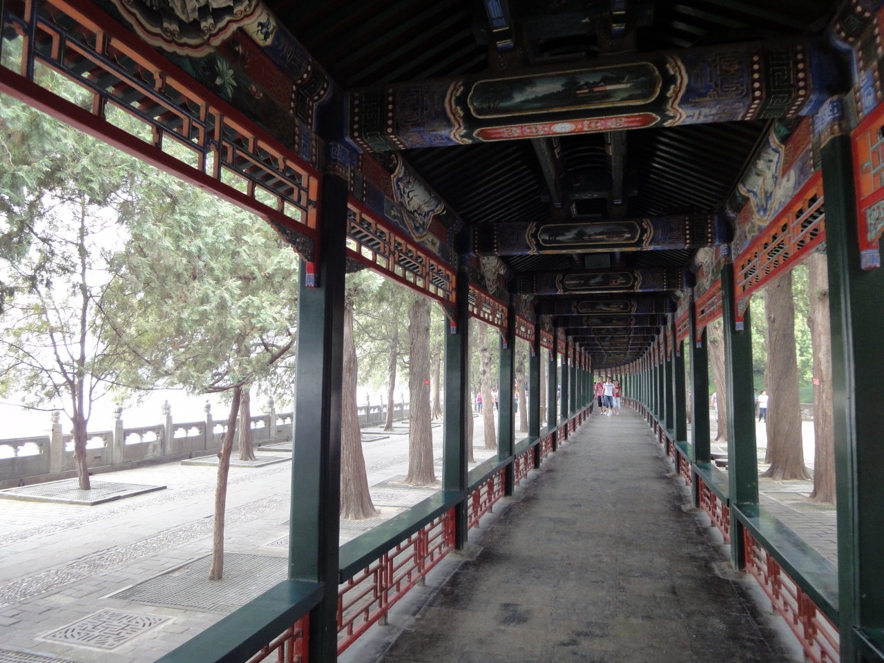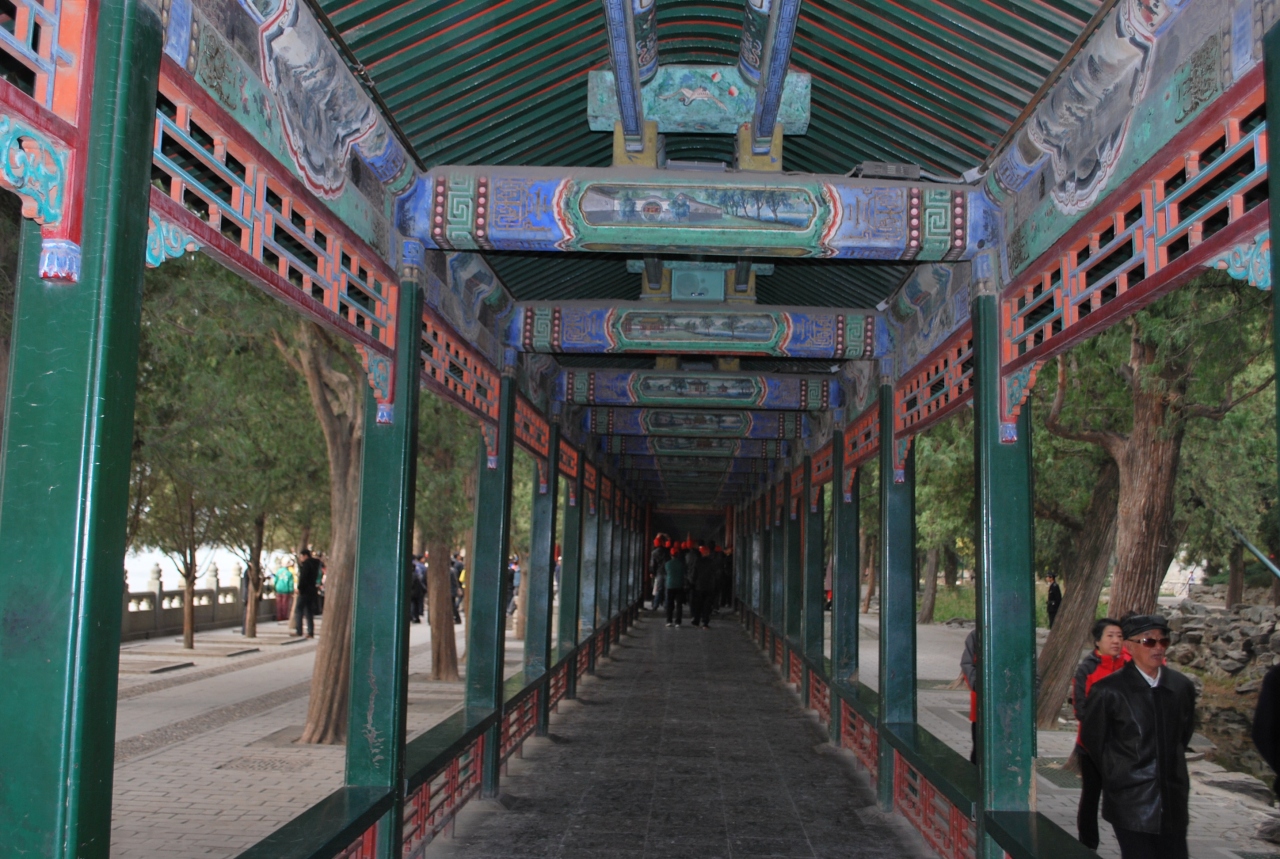 長廊の絵画は18世紀中頃に時の皇帝乾隆帝が宮廷絵師を杭州に派遣し西湖の風景を写生させ、それを長廊に描かせたのが始まりで、その後花鳥画や神話・物語の一節を描いた絵が追加され現在の規模に至っている。