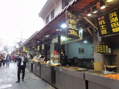 解放路脇に戸部巷の牌坊が建っています。この自由路が戸部巷・食堂街のメイン道路です。武漢では有名なB級グルメ、屋台で無く狭い...  続きを読むが店舗になっています。座って食べる席は無く皆さん食べ歩きを楽しんでいます。直ぐに独特な鼻に着く臭豆腐、餃子、ピリ辛に味付けしたジャガイモ、麺、串焼き、鶏の足、など、甘いデザート系、ジュースなどの飲料、色々な食べ物を売っています。  閉じる