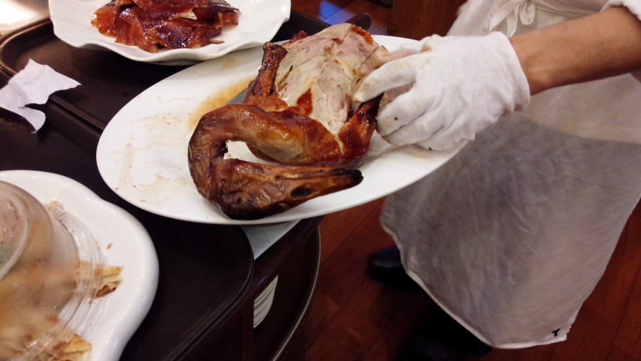 お通しのいんげんも美味しい。北京ダックが焼けると切り分けのパフォーマンスも楽しい。でも二人で1羽だとそれだけでお腹一杯!他の料理はあまり食べらませんでした。