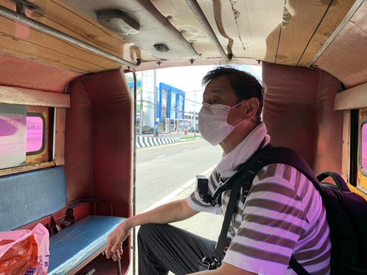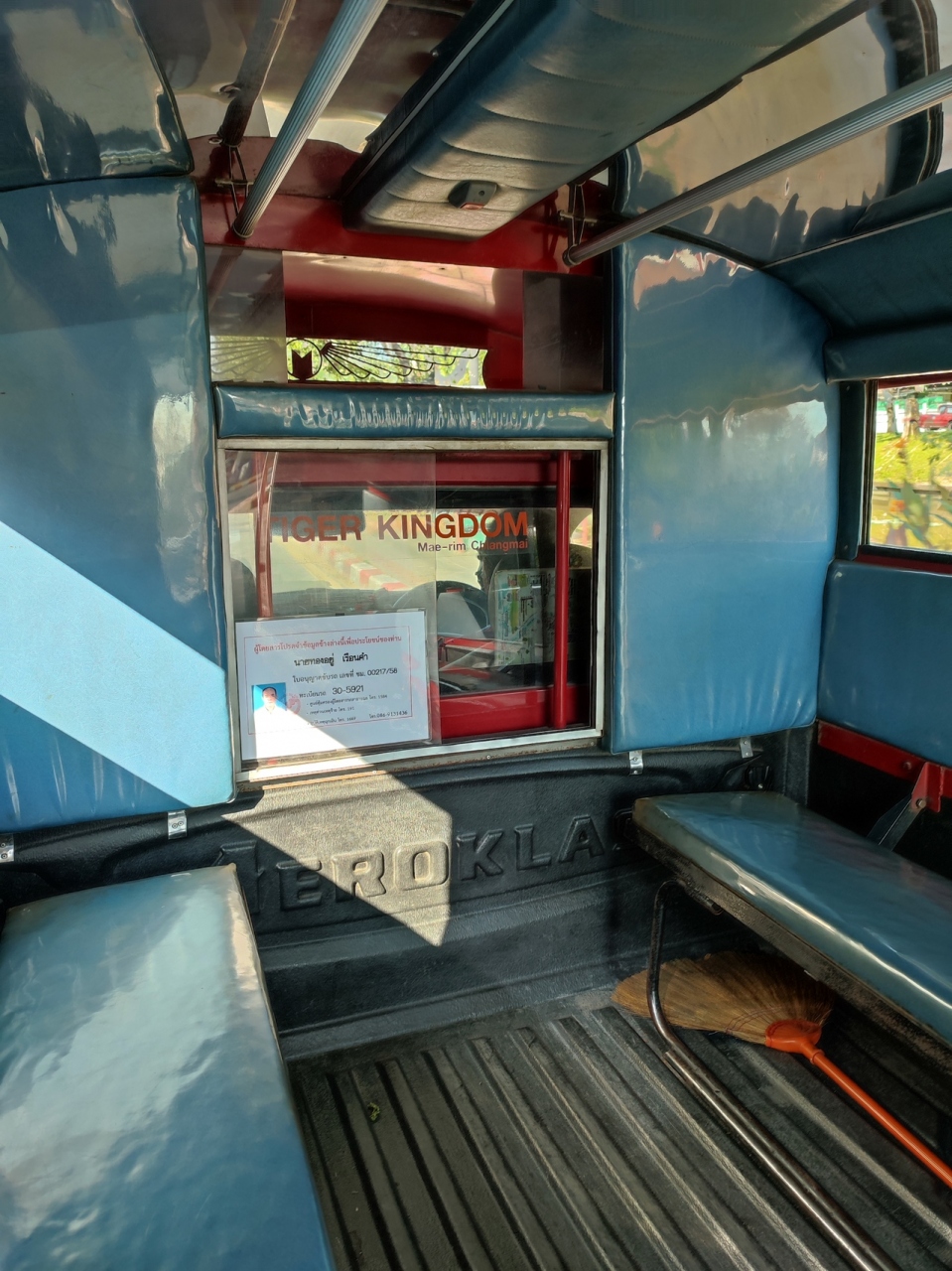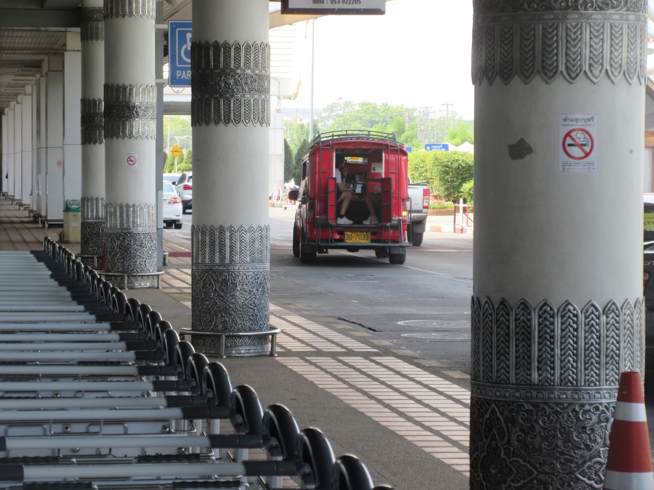 復路は寺院の徒歩向けの出入口のすぐ脇から出発、子供1人大人13人の14人(子供は膝の上、大人1人は座席がなく、乗降口に床に座り終始手すりを握る体制)、渋滞はなく13:40発14:25着(チャン・プアク門まで60THBドライバーへ支払い)でした。復路はニマン・ヘミン辺りから希望するところで下車していき、終点はターペー門(80THB)。