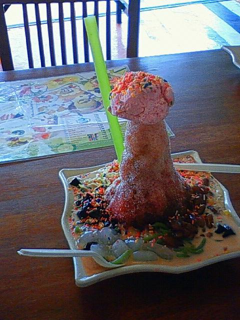 黒蜜のようなシロップがかかっており、氷山の下の海の部分には日本の煮豆みたいなのとか、ナタデココとか、緑の細長いゼリーとか、茶色で四角い寒天とかがてんこ盛り!