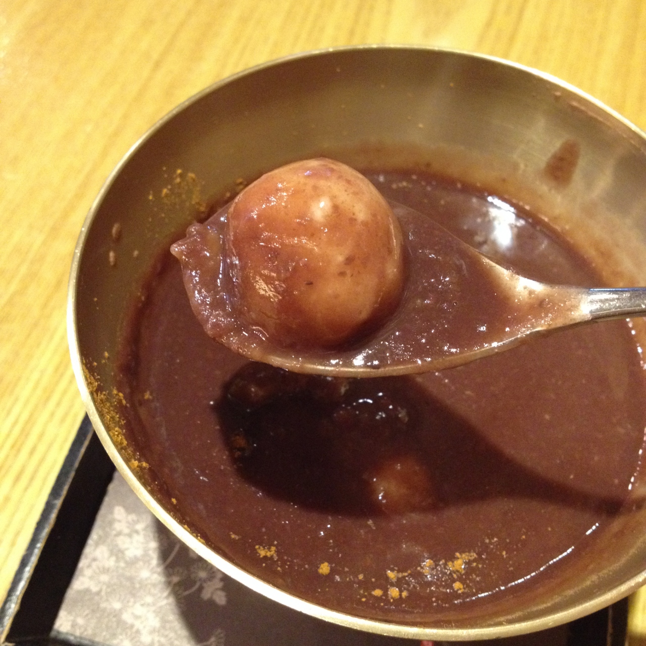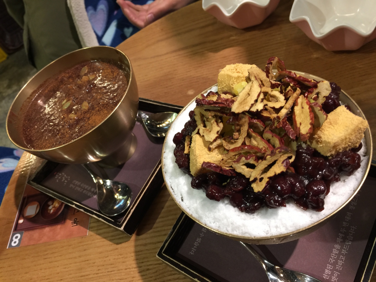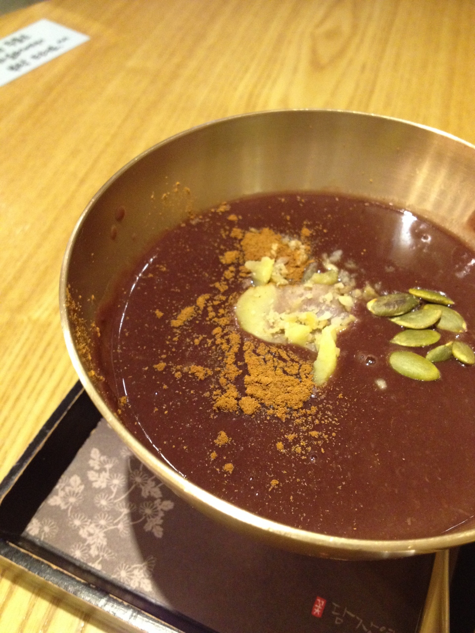 先に席を取ってから注文はレジカウンターで行い、その場で支払い。待ち時間はそこまで長くはなく、タンパッチュ登場。真鍮(なのかな?)の器が美しいです。中は見るからにまったりした小豆粥(粒のないタイプ)、上に振りかけられたシナモンが良い香りを放ってて幸せな気分。一口食べると思っていたよりもずっと甘さ控えめでした。お餅はふんわりと柔らかく、パンプキンシードは香ばしくて味がしっかり。栗はほくほくで。一口ごとにしみじみ美味しく、食べ終わるのが惜しいくらいでした。
