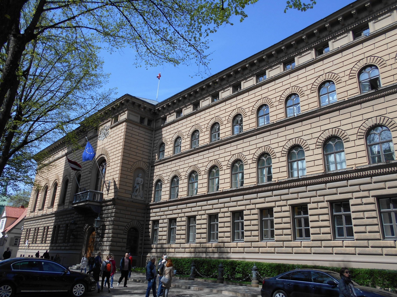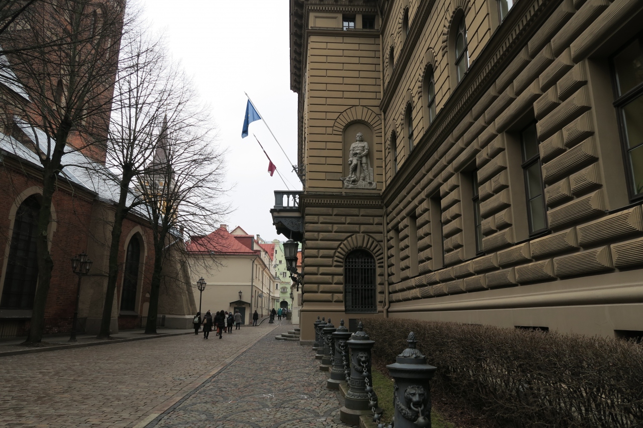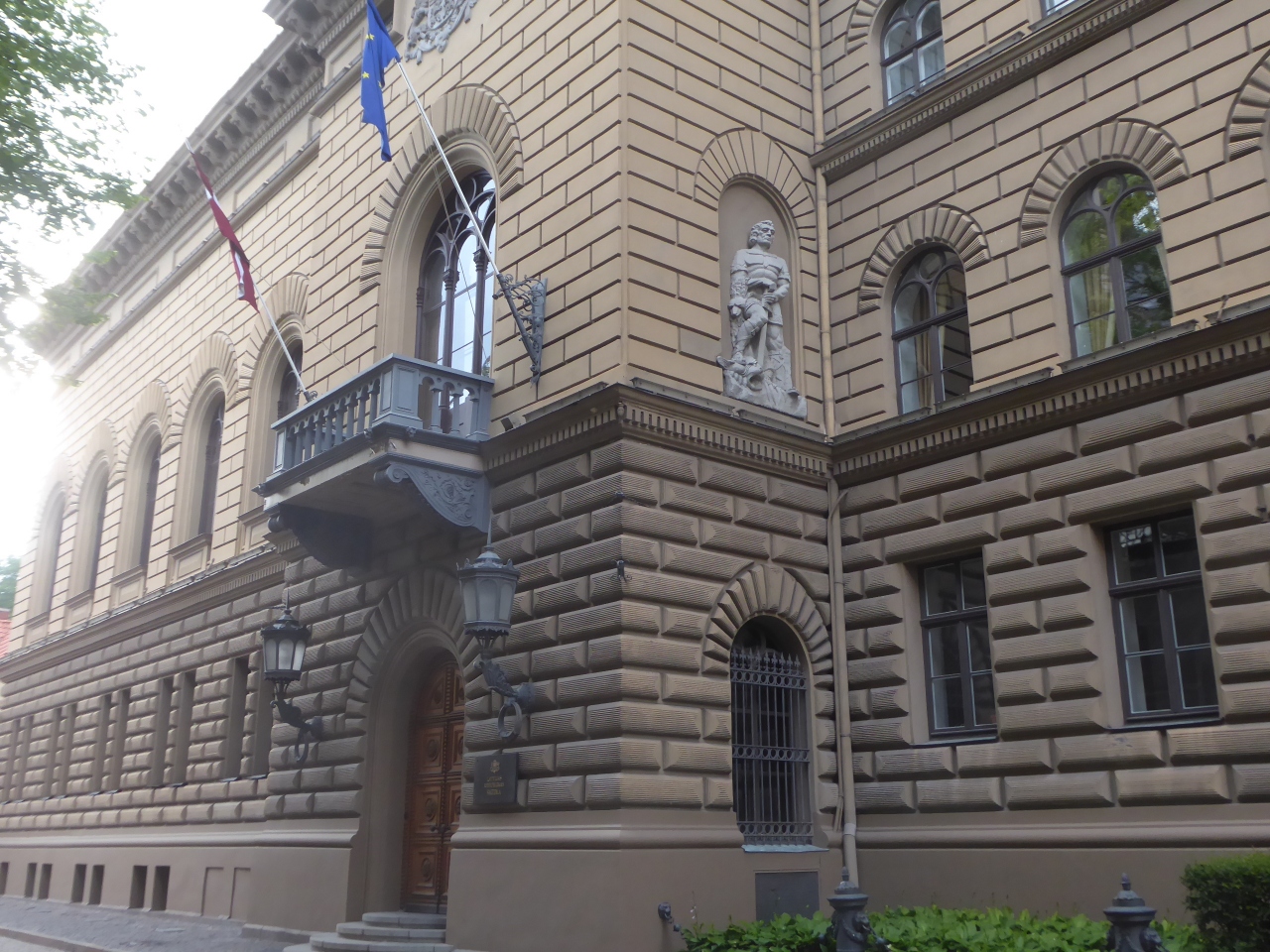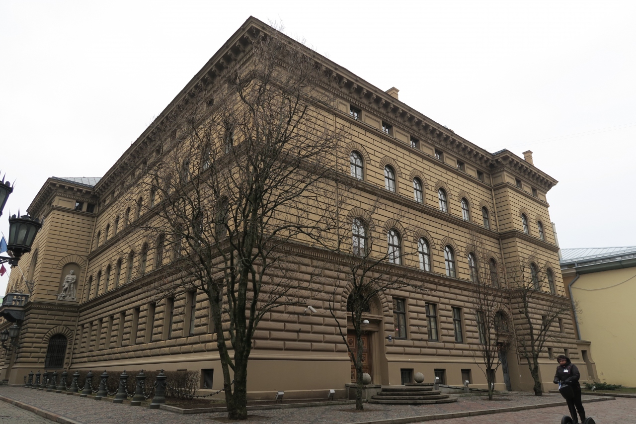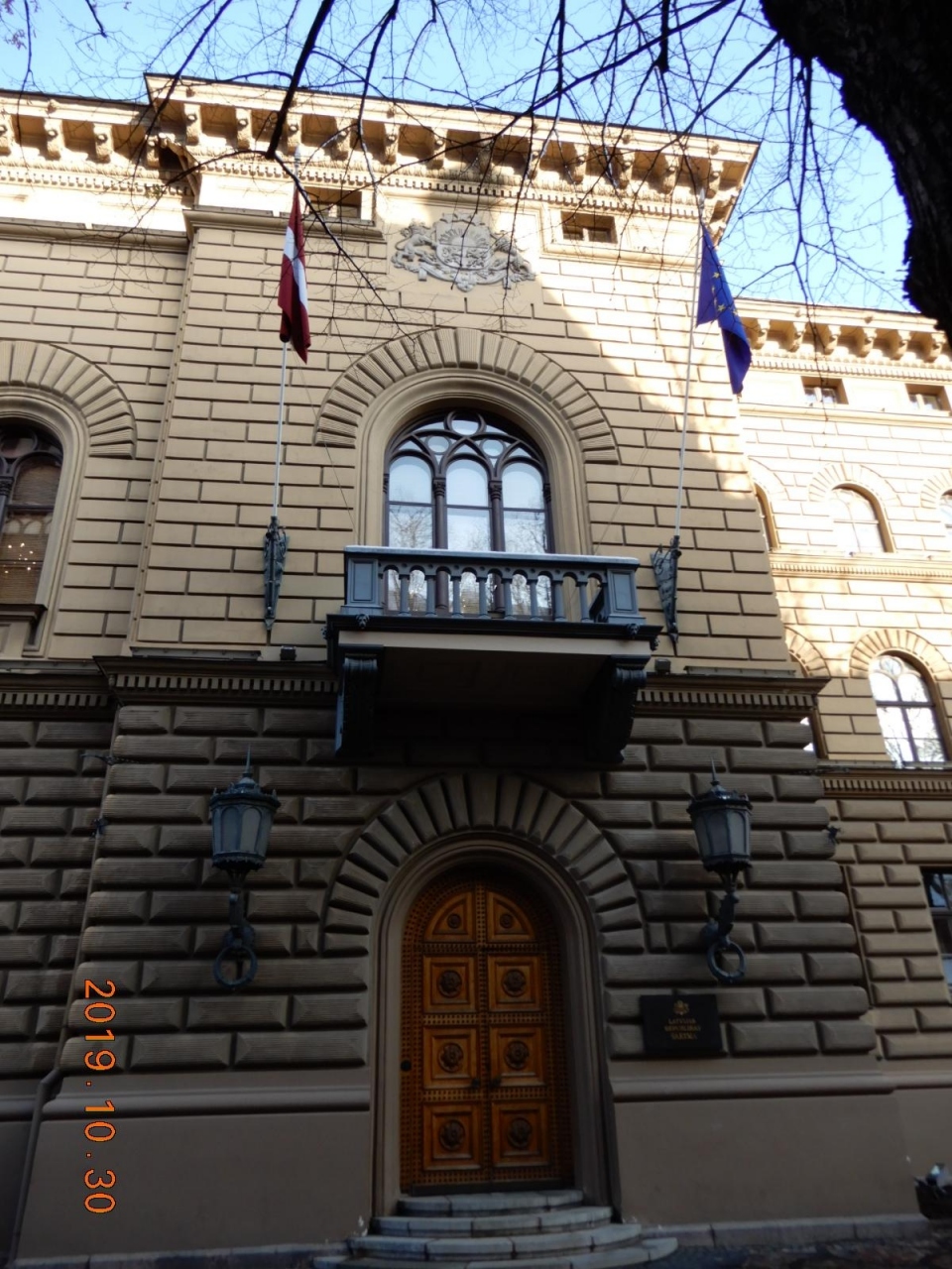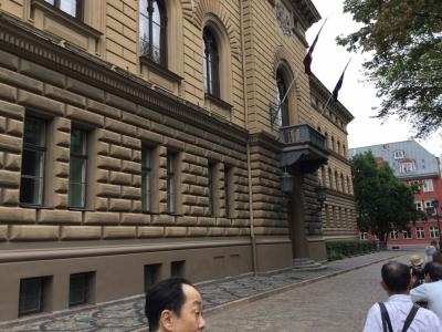リトアニア国会議事堂は、旧市街の中心部にあります。近くにバリケード記念碑がありました。1991年にロシア支配から独立する際... 続きを読むに、この場所にバリケードを築いてロシア軍に対抗し、多くの市民が犠牲になったそうです。石積の国会議事堂は、薄茶色の地味な建物ですが、国旗が掲げられているので国の機関であることが分かりました。建物壁に金色文字のプレートがあり、ラトビア議会と記されています。国会議員は100名定員で、任期は4年だそうです。
