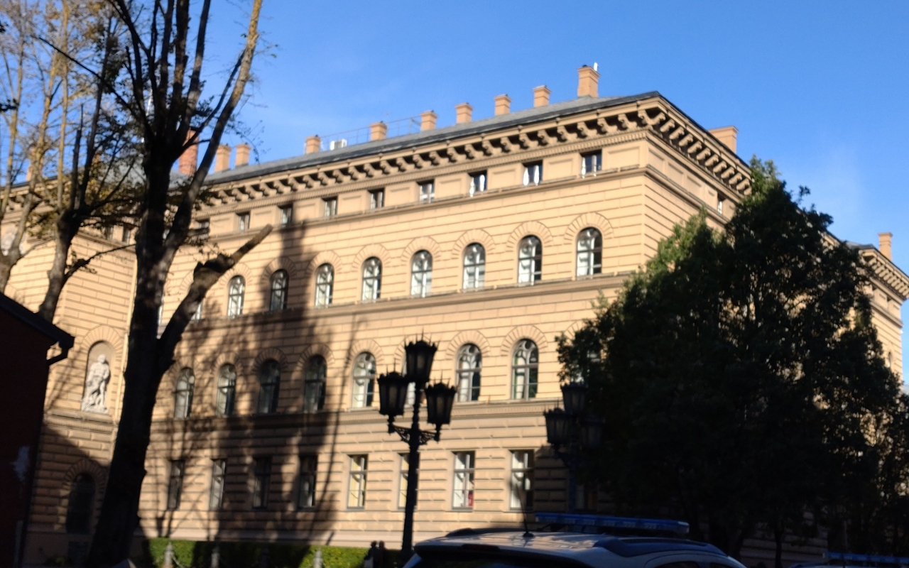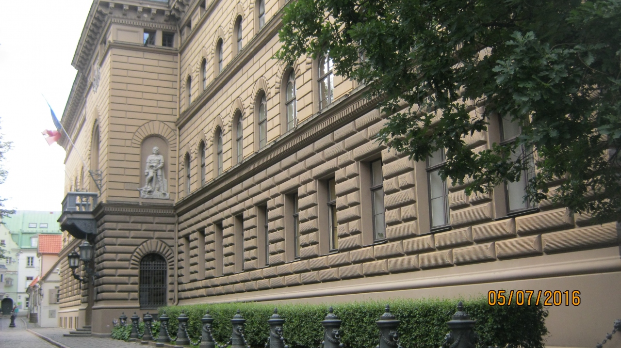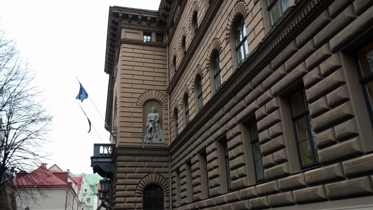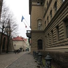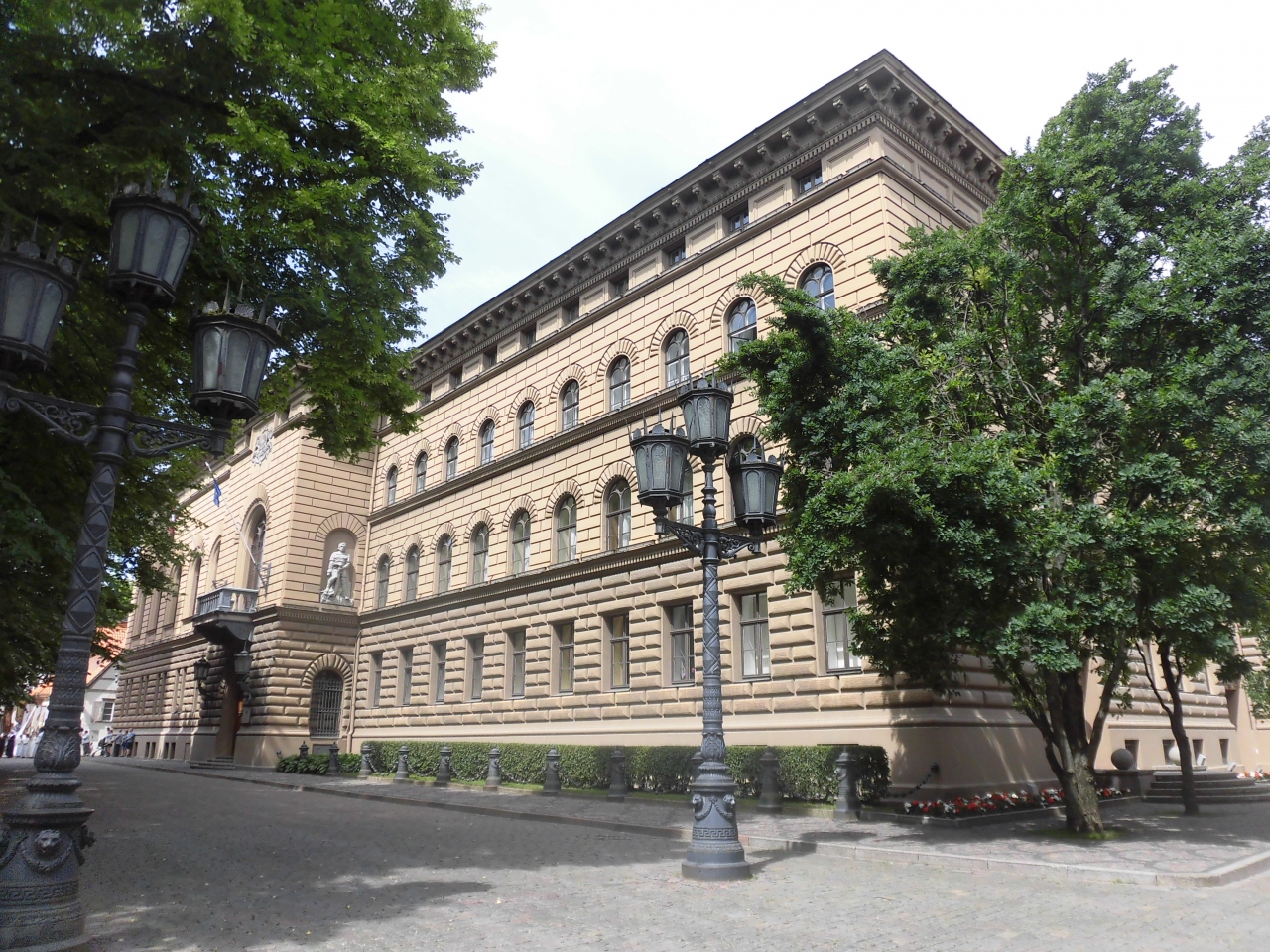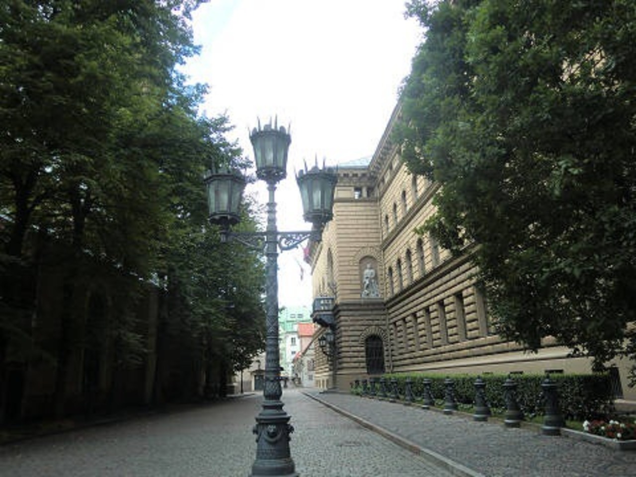 リトアニア国会議事堂は、旧市街の中心部にあります。近くにバリケード記念碑がありました。1991年にロシア支配から独立する際... 続きを読むに、この場所にバリケードを築いてロシア軍に対抗し、多くの市民が犠牲になったそうです。石積の国会議事堂は、薄茶色の地味な建物ですが、国旗が掲げられているので国の機関であることが分かりました。建物壁に金色文字のプレートがあり、ラトビア議会と記されています。国会議員は100名定員で、任期は4年だそうです。