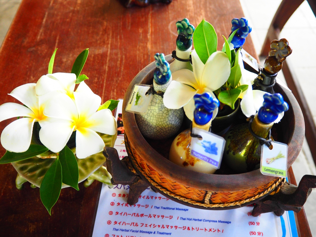 タイ古式マッサージとハーブボール、アロマオイルマッサージの3時間半コースにしました。タイ古式マッサージは左右ばらばらの施術の動きで背中まで施術してもらえず腕と足だけで終わりそのままハーブボールのコースに。。