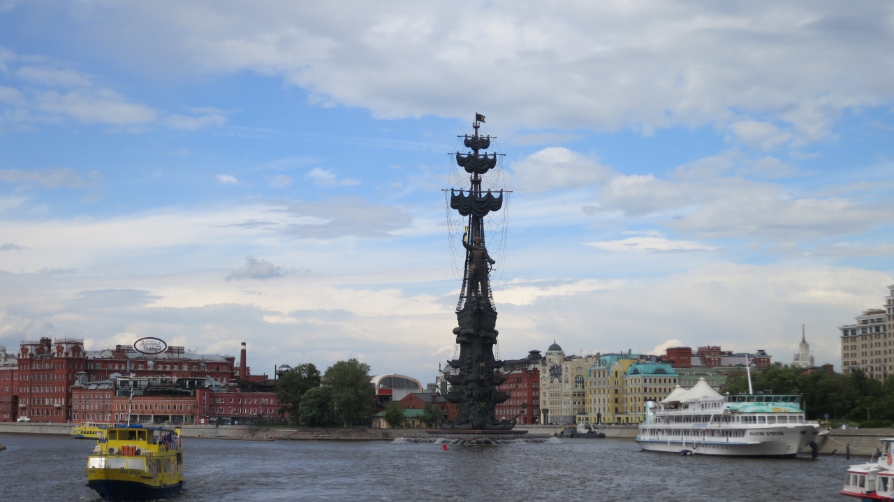 モスクワ川クルーズで遭遇する巨大なピョートル大帝記念碑