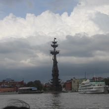 モスクワ川ディナークルーズですぐ近くから見学しました。この巨大な像は、モスクワ川の中州であるボロトン島の先端部で、モスクワ... 続きを読む川がボドヴォドニー運河に分岐する箇所の小島に設置されています。ロシア海軍の300周年を記念して1997年に設立されています。高さ98m、総重量1000トンに及ぶ巨大像でステンレス鋼、真鍮、および銅で構成されています。
