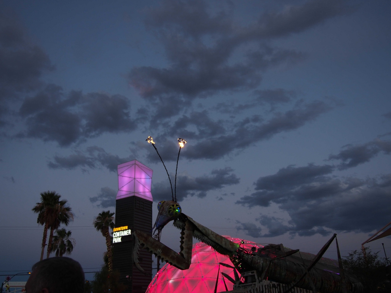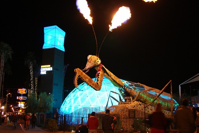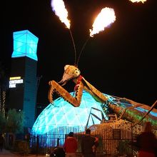 夜に行ったのですが、エントランスの大きなカマキリは、音楽に合わせて触角から火をふいたり、クリスマスツリーやイルミネーションもキレイで、ステージではライブコンサートもおこなわれていました。