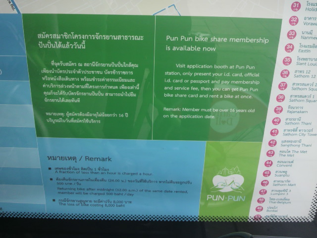 グリーンバンコクバイクの利用料金の説明が掲示されています。