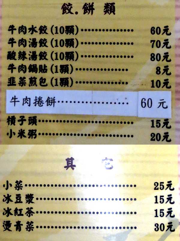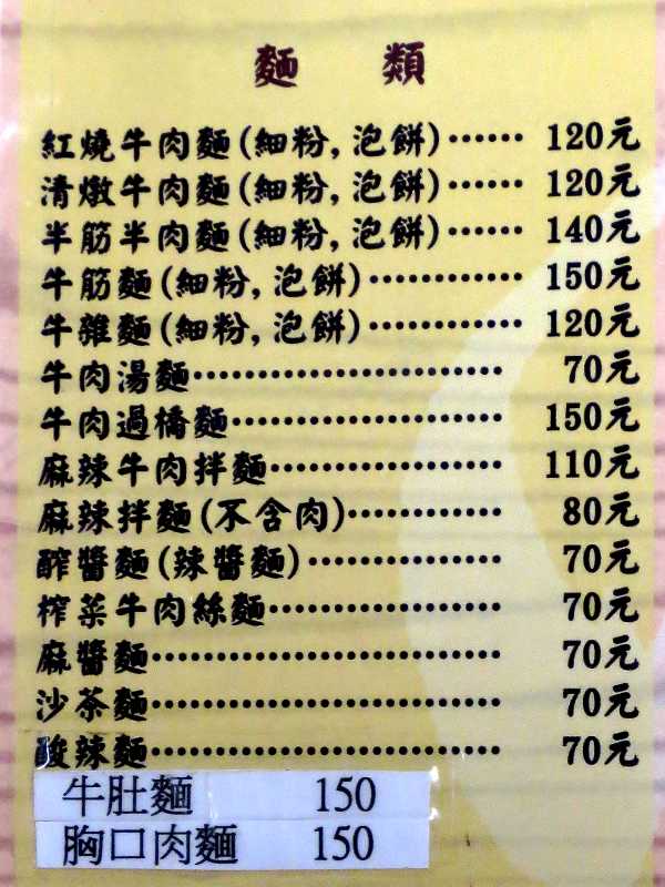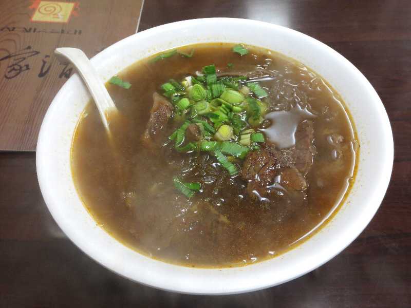 メニューで牛肉麺の後ろには「…牛肉麺(細粉、泡餅)」と書いています。細粉は、日本のラーメン店でよくある細麺の選択だと思って「細粉」を注文したのですが、店員さんが怪訝な顔でそれで良いのかと念押しするので勘違いだと分かり、普通の麺に訂正しました。細粉は日本で言うハルサメの事でした。もう一つの選択肢の「泡餅」は帰国してからネットで調べましたが、薄い餅(中華風お好み焼き)をちぎってスープに入れて食べる料理らしいです。
