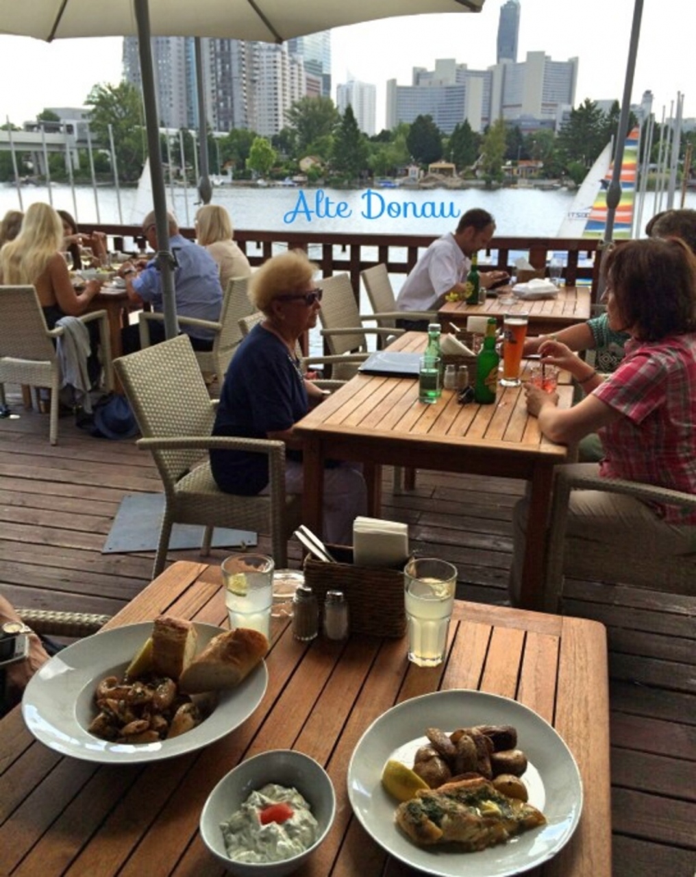 旧ドナウ川三日月湖のほとり、水上テラスで魚や肉のグリル料理を!