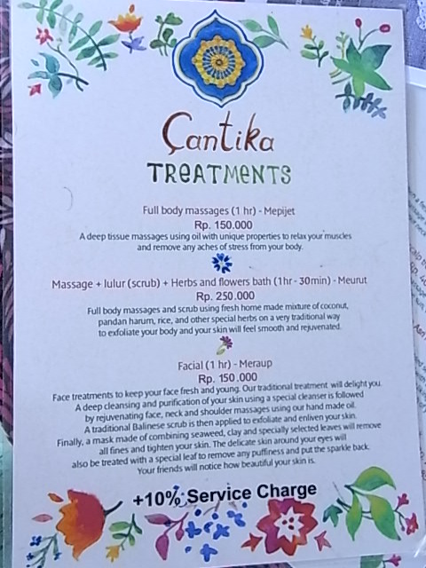 ウブドの中心から外れた静かな地域に有ります。 以前NHKの二度目のバリで紹介され行ってみたいとおもっていました。 Wh... 続きを読むatsAppで連絡してメニュー表を貰い、予約することが出来ます。 技術は高くとても安いと思います。 4人で行き、2人ずつ分かれて全身のマッサージを受けました。 非常に気持良く肌がワントーン白くなったように思います。フラワーバスが日常を忘れさせてくれます。 バスの後、シャワーを浴びて終了。 受付ではオーガニックオイル、SOAP、シャンプー、スクラブなど販売されています。 閉じる