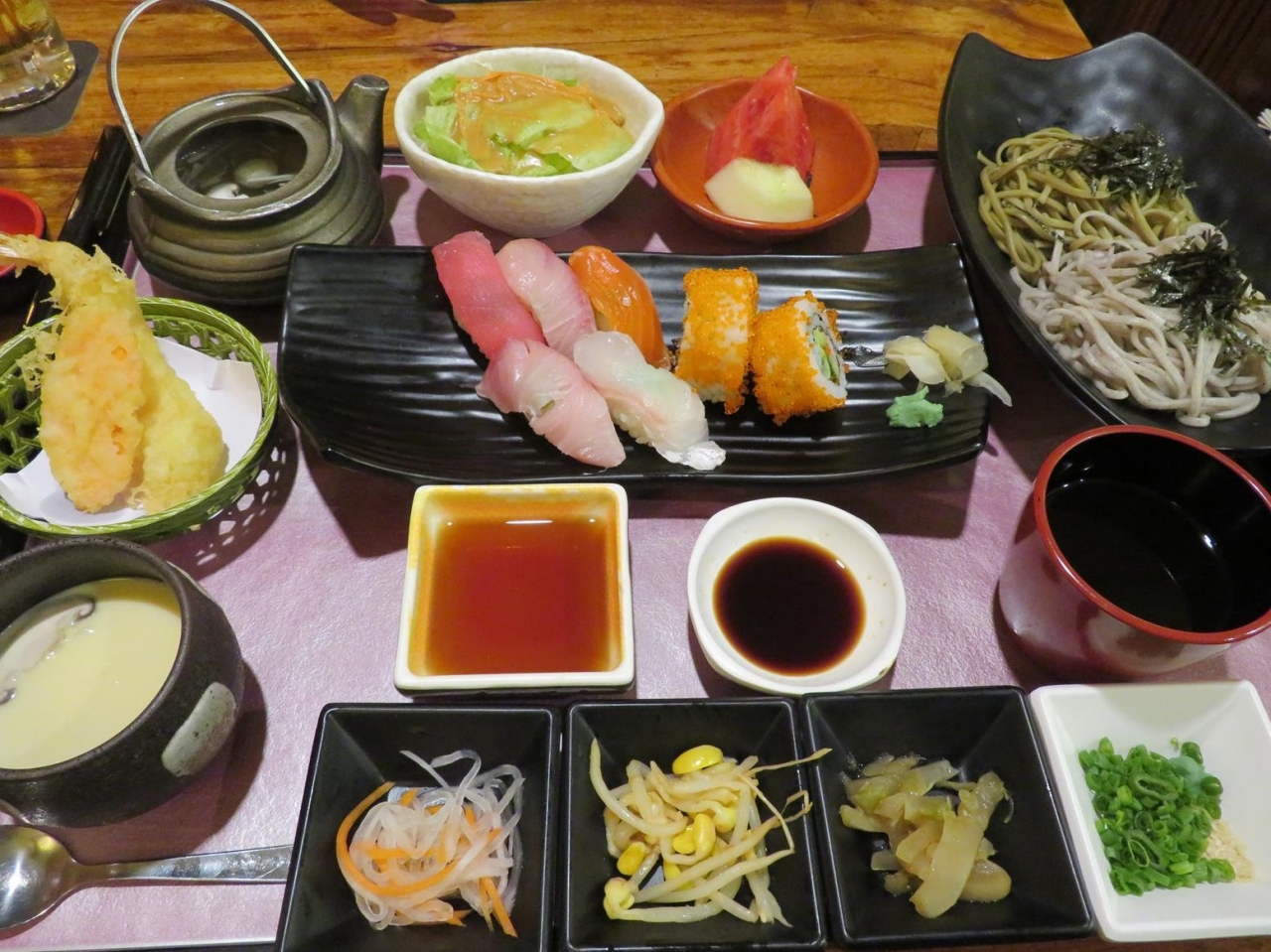 私たちは≪あいのりそばと寿司御膳≫、散らし寿司、それにサーモンの刺身を追加で注文。