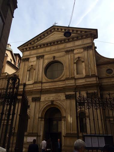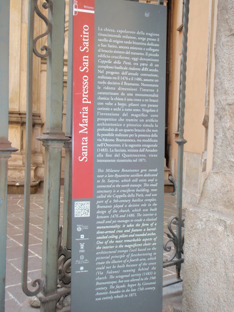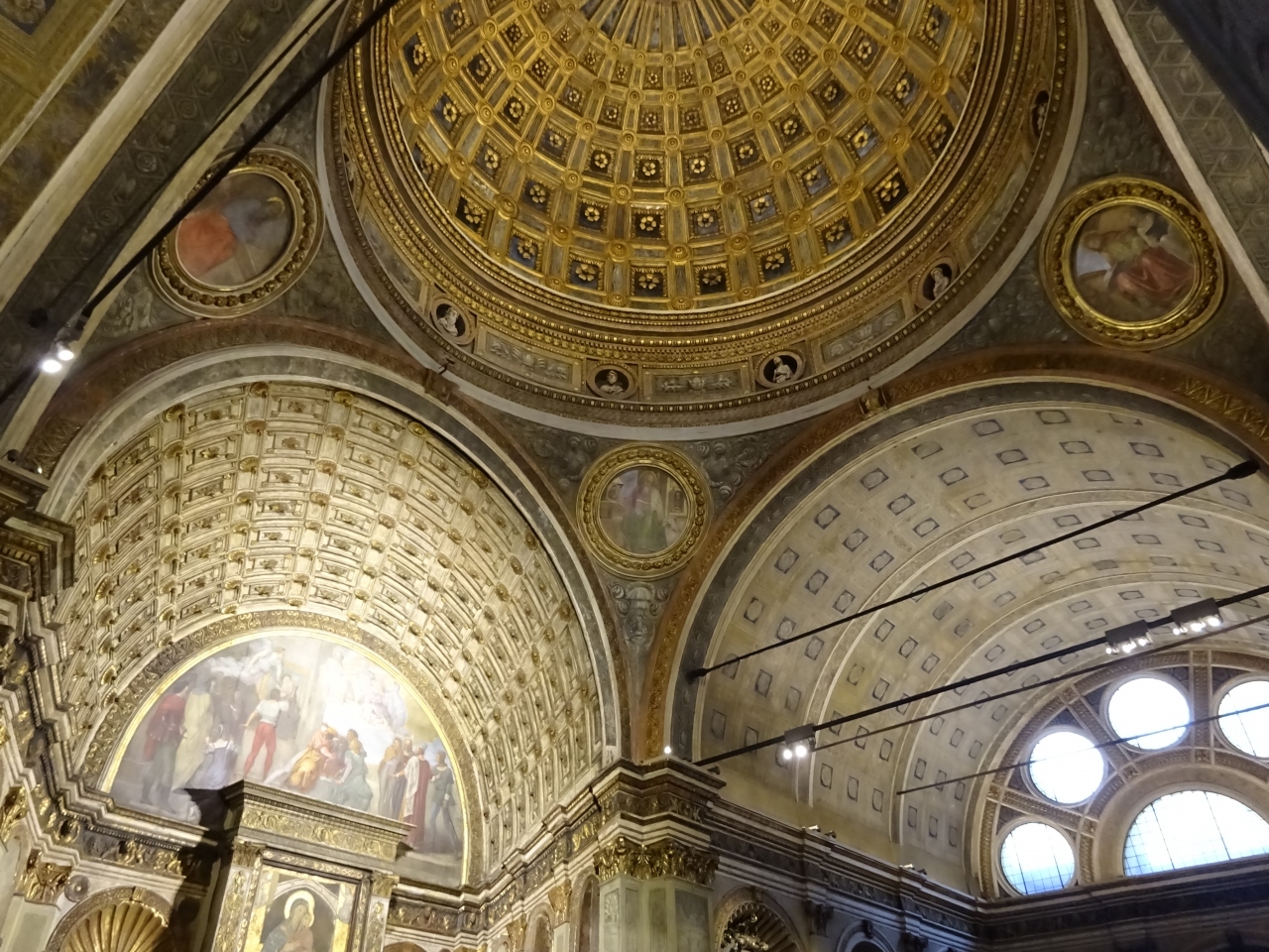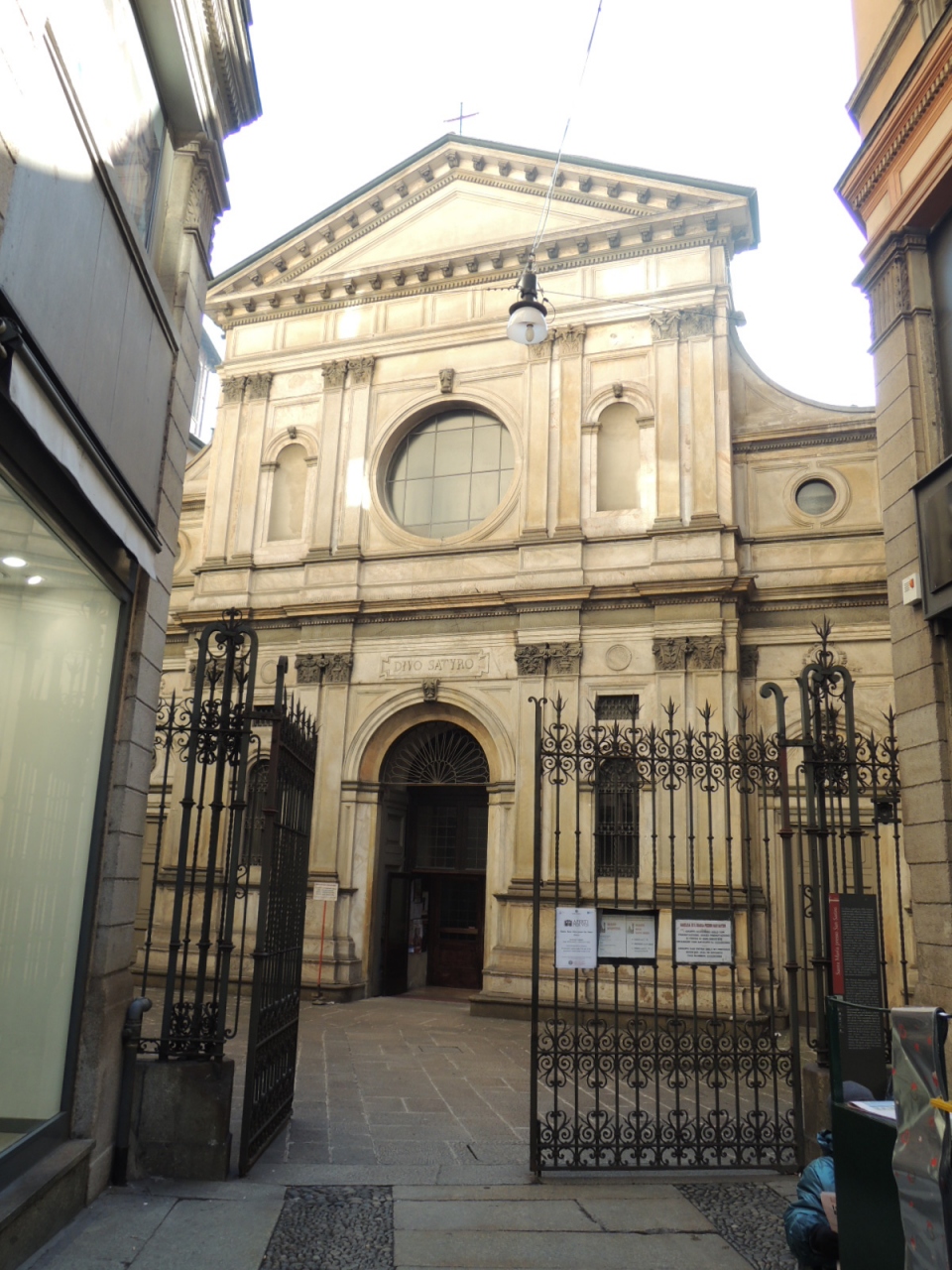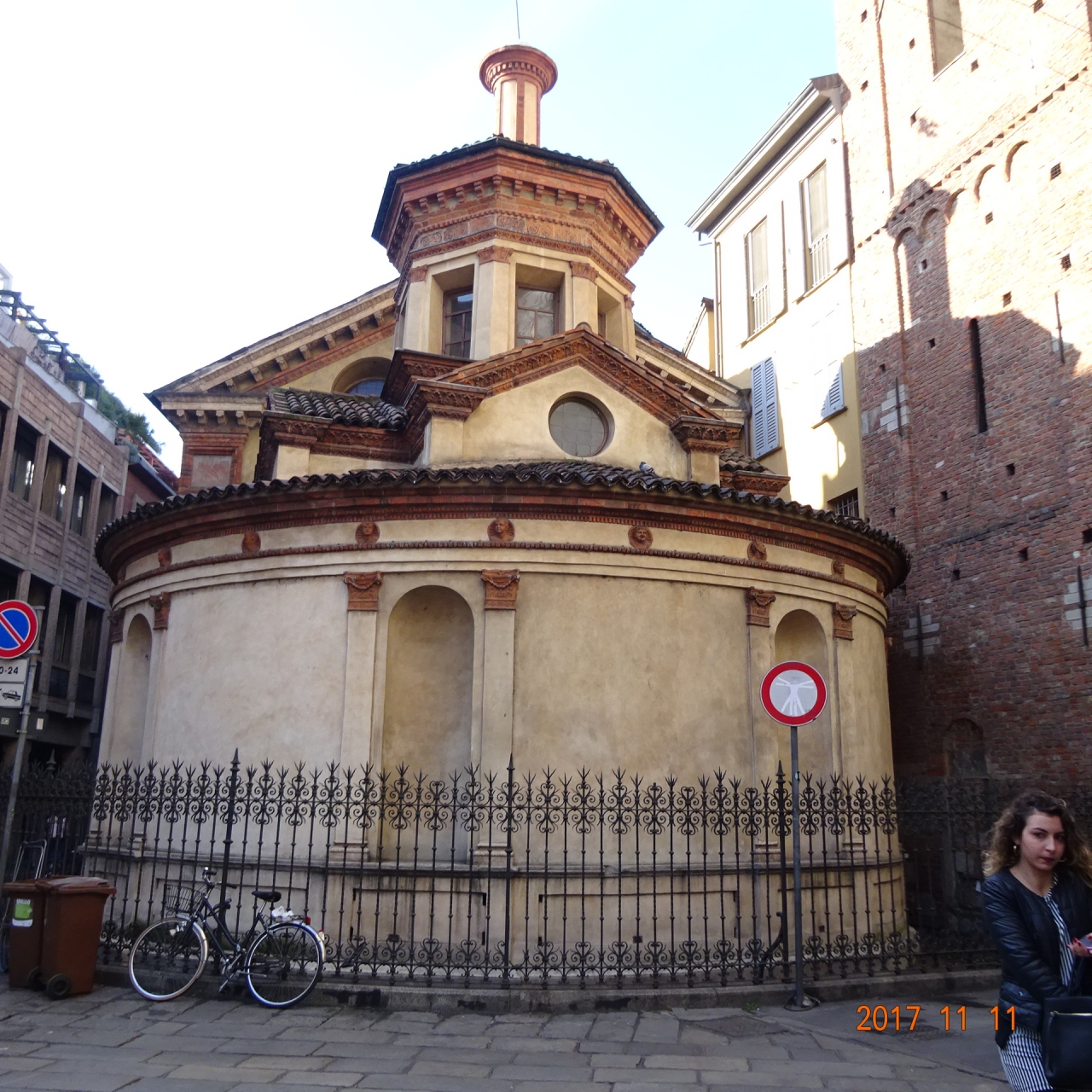 ドゥオーモから南に歩いて5分ほどの「サンタ・マリア・プレッソ・サン・サティロ教会」に行きました。ビルの間の路地奥にある小さ... 続きを読むな教会です。ファサードは思いのほか簡素ですが、初期ルネッサンスの宝石とも呼ばれる有名な教会で、熱心な信者が常にお祈りをしていました。