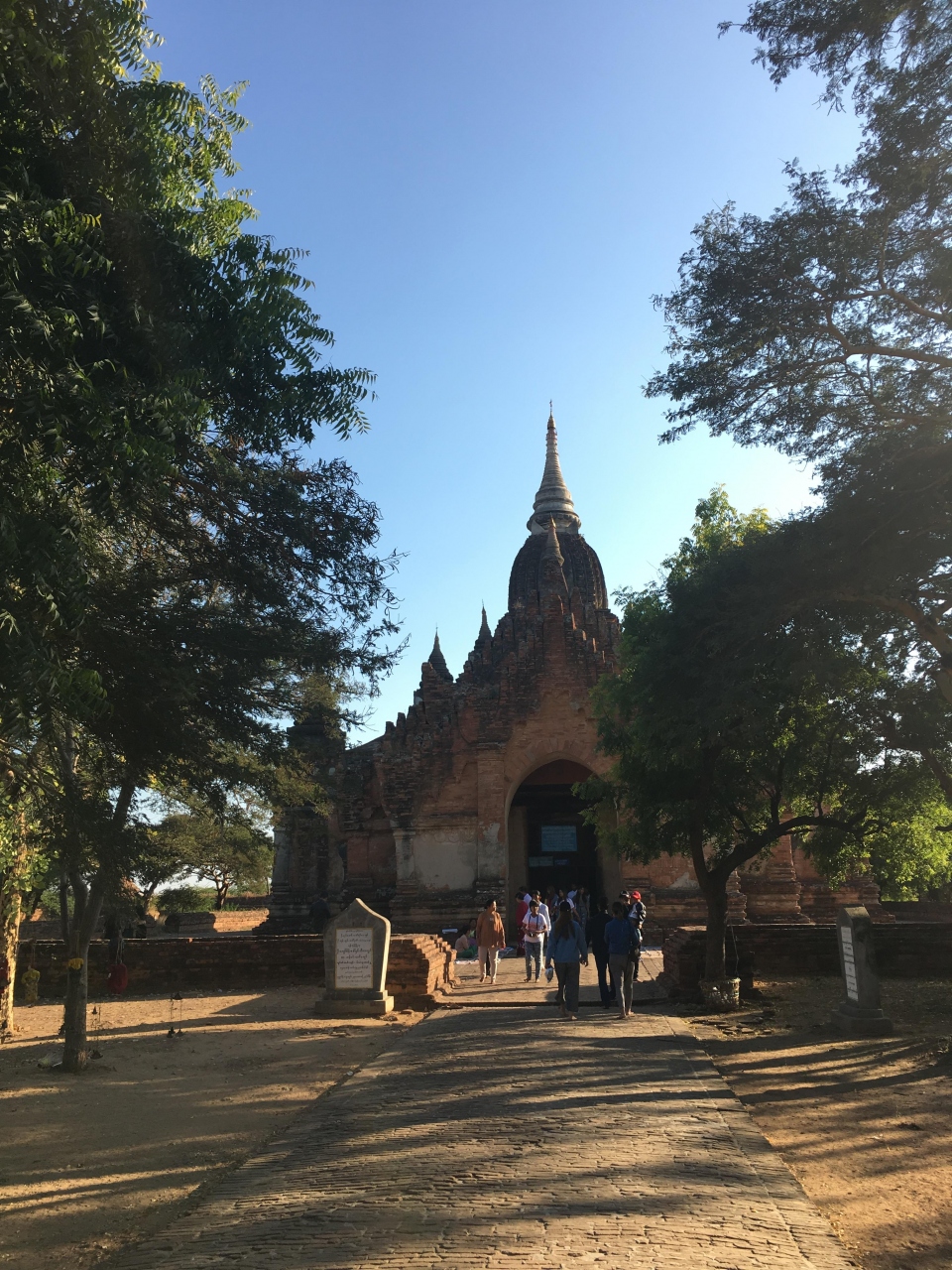 レン... 続きを読むガ敷きの参道は土足OKで、奥に見える寺院の手前まで履物のまま歩いて行けますが、建物の手前10m地点で靴を脱ぐ看板が立てられているため、日中の気温が40℃を超える乾季のバガン観光だと大変で、目玉焼きが焼けそうなほど熱いレンガを、素足で走り抜ける必要があります。