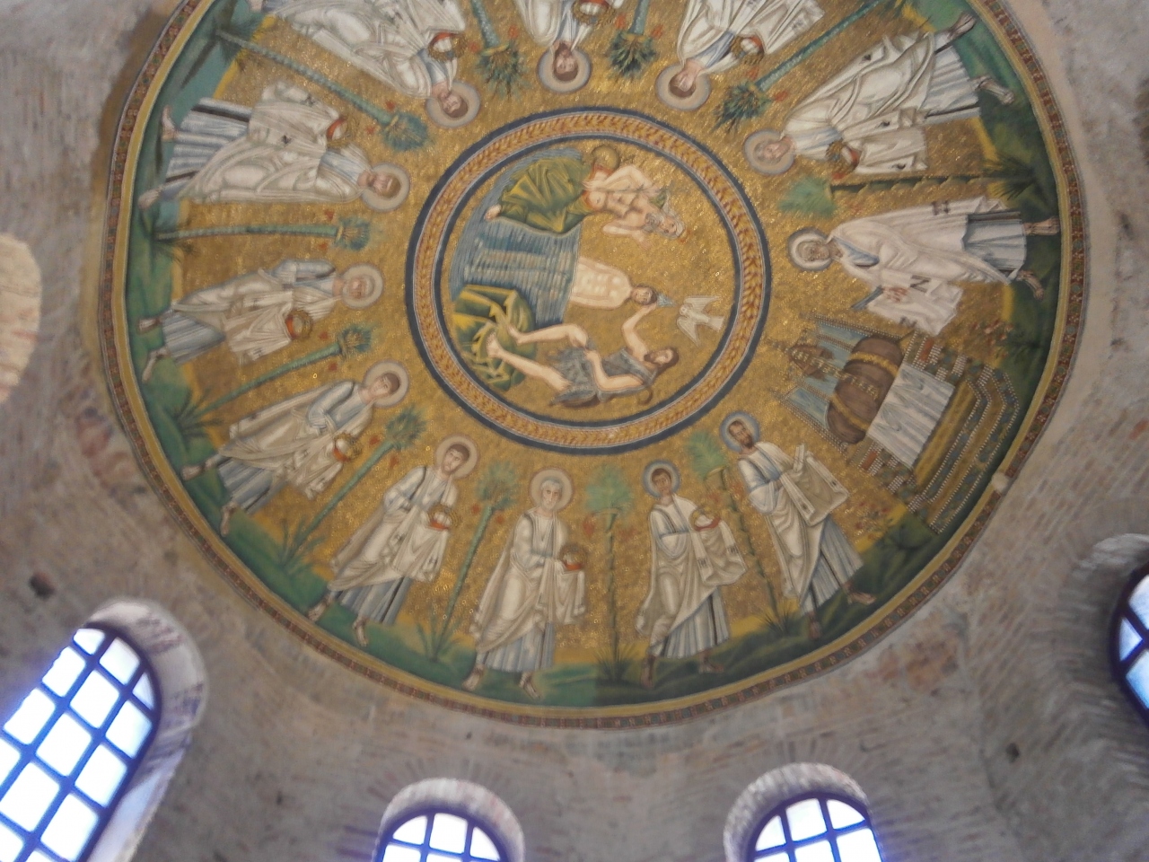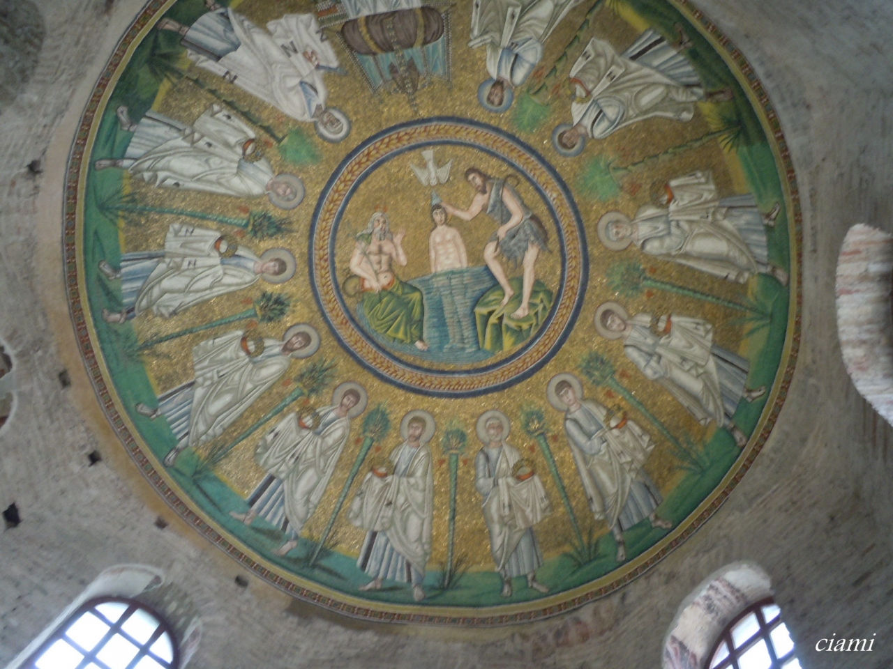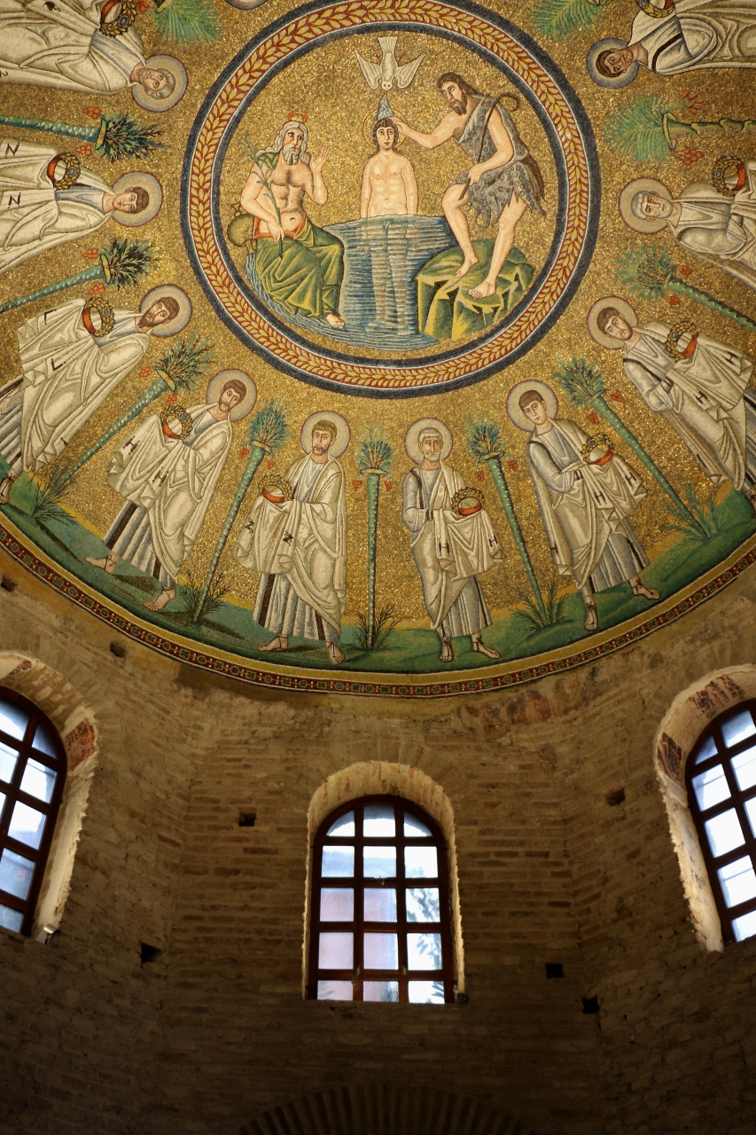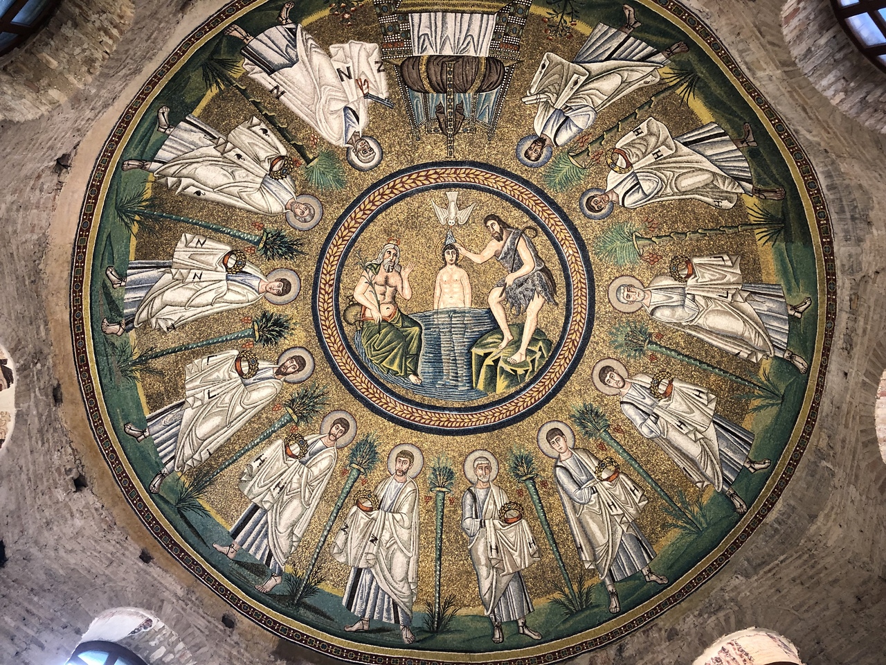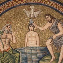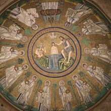 ラヴェンナ市内には正統派カトリックの「ネオニアーノ洗礼堂」もあり、同様に天井には「ヨルダン川で浸礼を受けるイエス」の図が描かれています。非常に似ている構図なのですが、三位一体説を否定しキリストをより人間に近い存在として捉えていたアリウス派の(アリアーニ)洗礼堂のほうが、イエスがより人間らしく描かれているとされています。見比べてみるのも面白いと思いますので、是非足を運ばれてみて下さい。