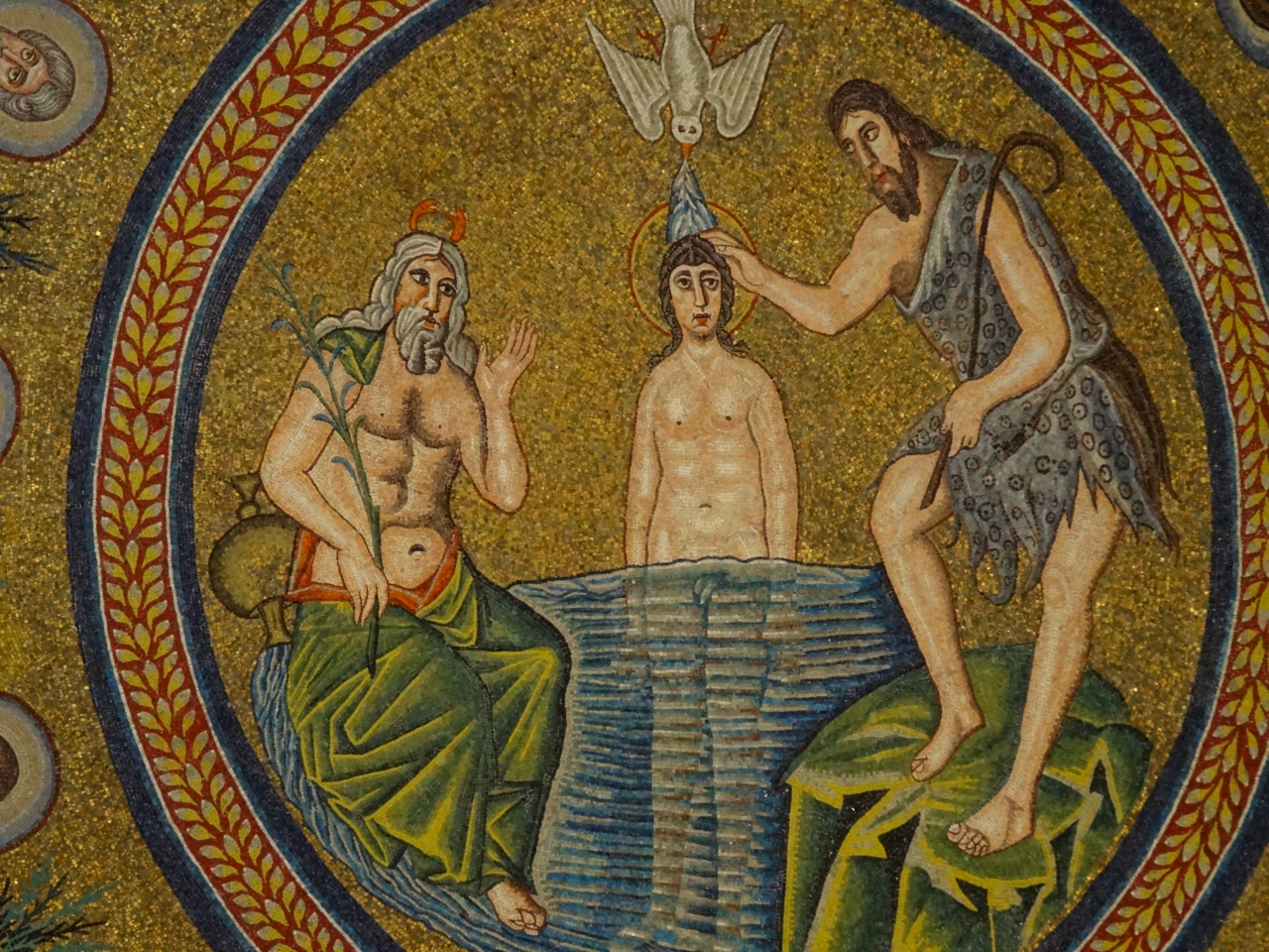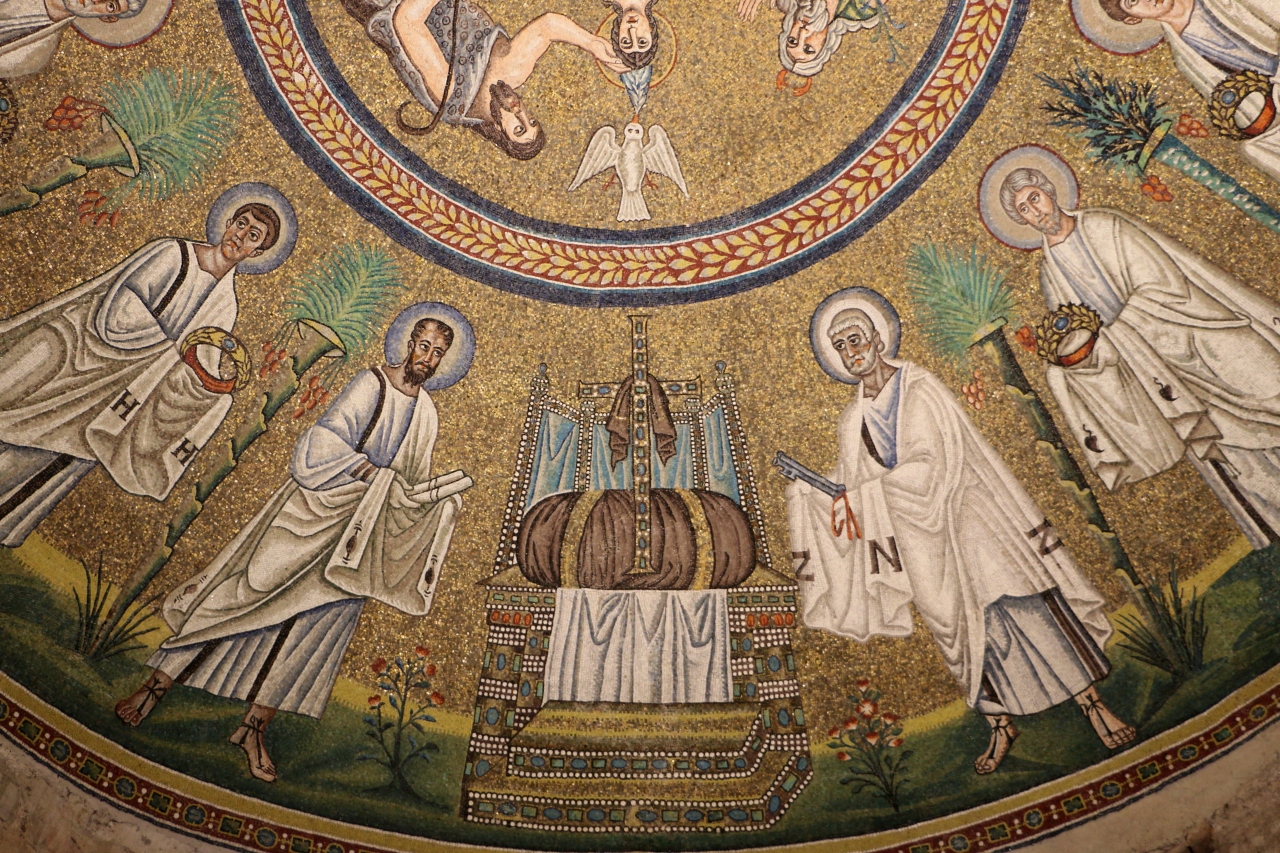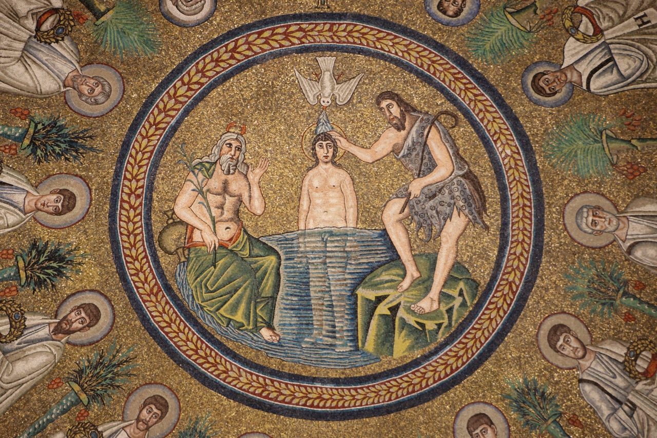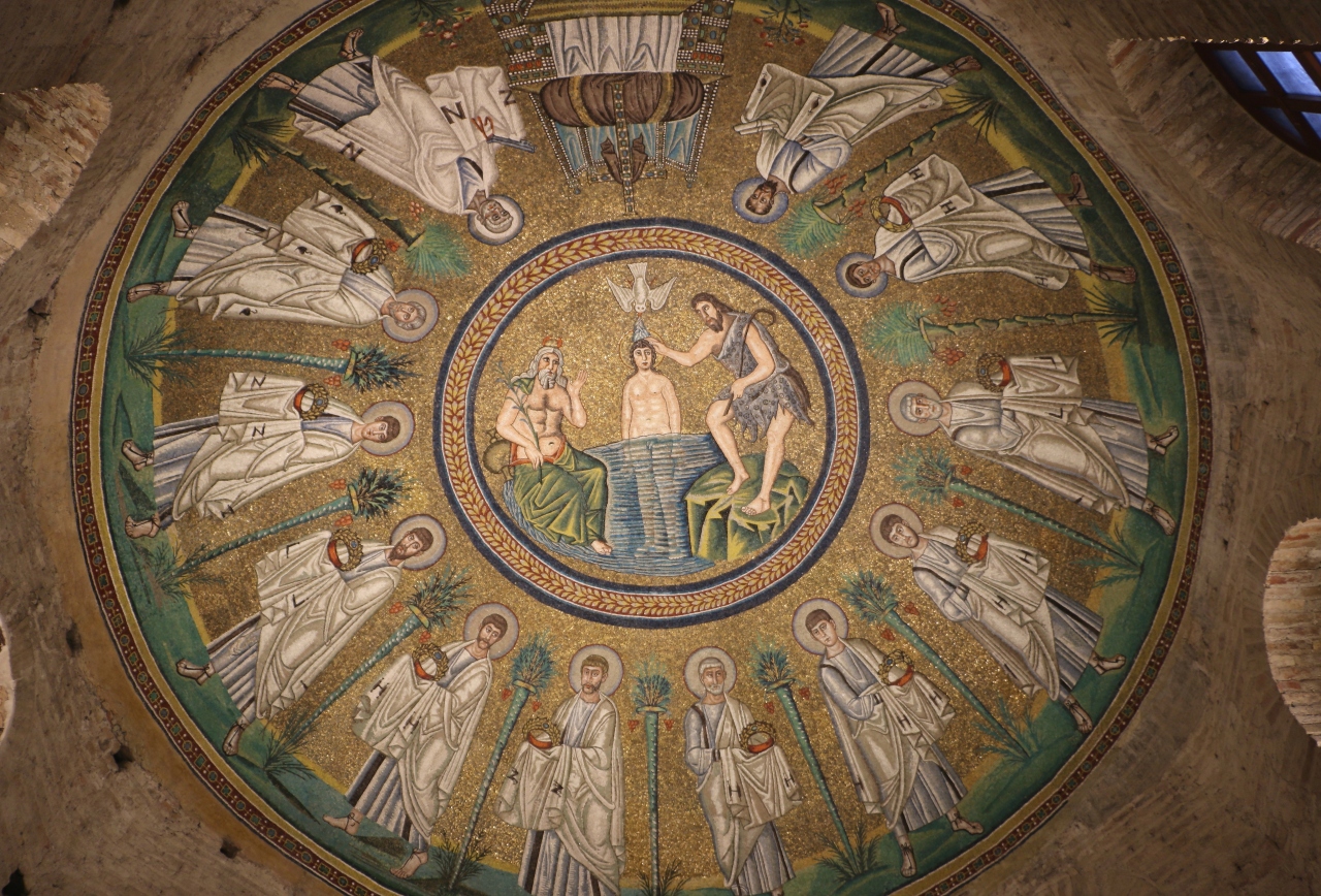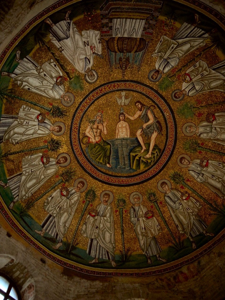 ラヴェンナ市内には正統派カトリックの「ネオニアーノ洗礼堂」もあり、同様に天井には「ヨルダン川で浸礼を受けるイエス」の図が描かれています。非常に似ている構図なのですが、三位一体説を否定しキリストをより人間に近い存在として捉えていたアリウス派の(アリアーニ)洗礼堂のほうが、イエスがより人間らしく描かれているとされています。見比べてみるのも面白いと思いますので、是非足を運ばれてみて下さい。