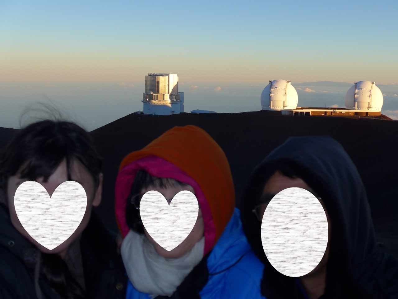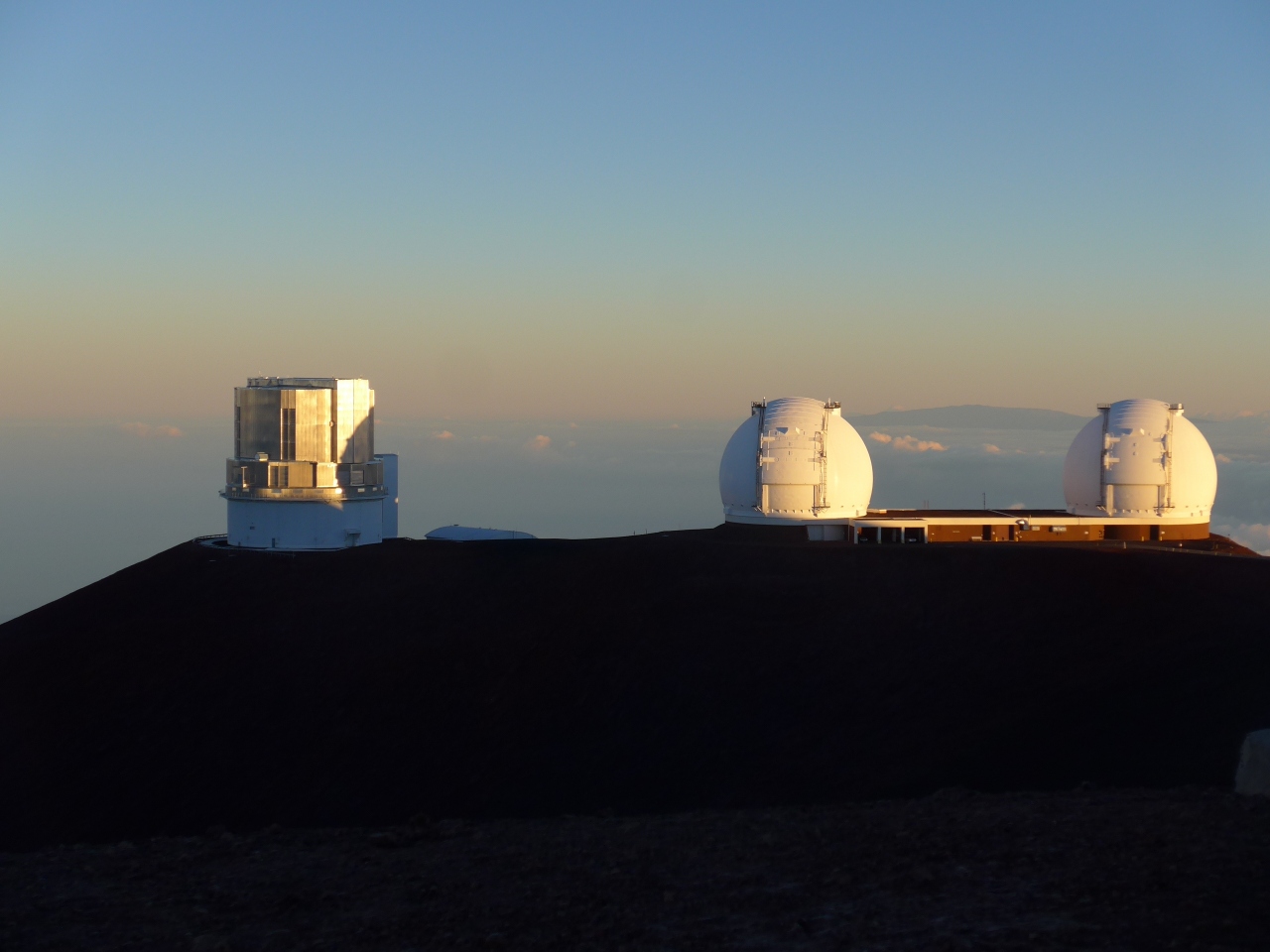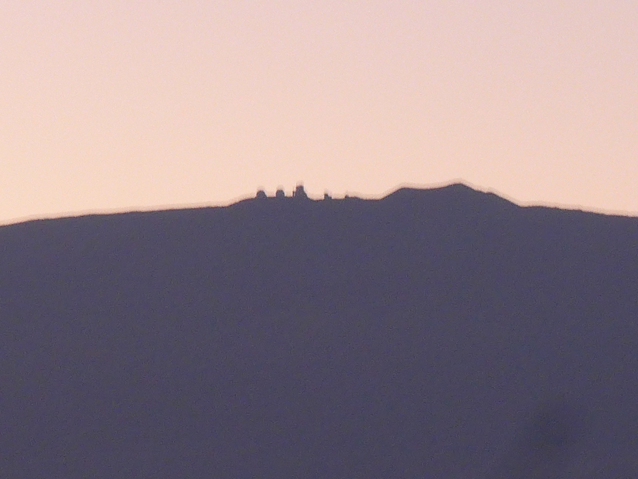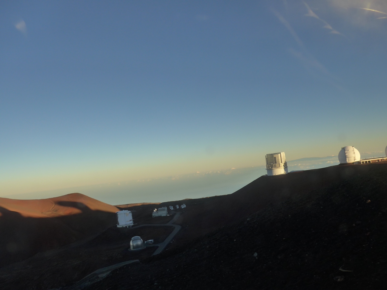 すばる望遠鏡の建物左には大昔に噴火口だった山が見えます