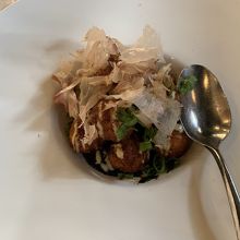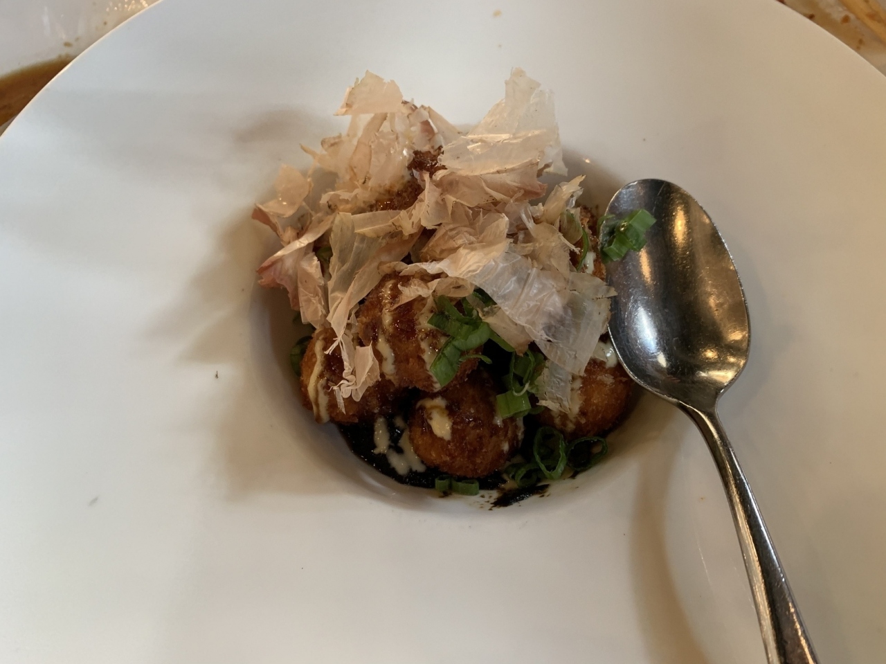 見た目がたこ焼きなお料理、そしてデザートのマンゴーシェイブアイスがモチモチ食感でとてもよかったです。何度も行く機会があるのでなければ、ハッピーアワーではなくディナーをオススメします
