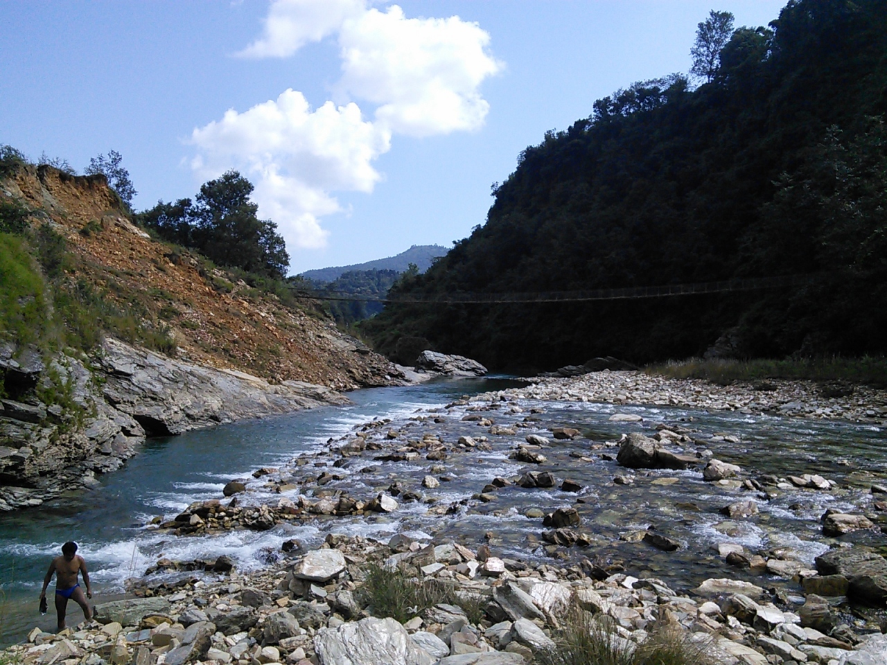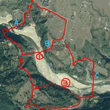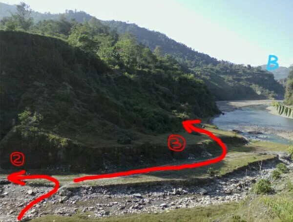 ②はちょっとワイルド。Cの吊り橋を渡った後は右へ。すぐに左に別れる小道がありますがまっすぐ進み、小さな柵をまたぎ河原に降り、支流を渡ります。左の支流沿いに進みます(写真参照)が普段人が通らないためか道はあまり整備されていません。途中柵を越え、やや大きな道に出たら右へ。村を抜け進むとBの吊り橋に出ます。人気のない道が多いので十分気を付けて下さい。