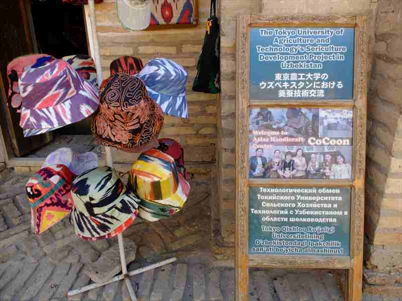 日本の東京農工大学がサポートしていたお店でもあるそうで、アトラス(絣模様の色鮮やかな絹織物)を使って作った小物類が主力商品になっていました。