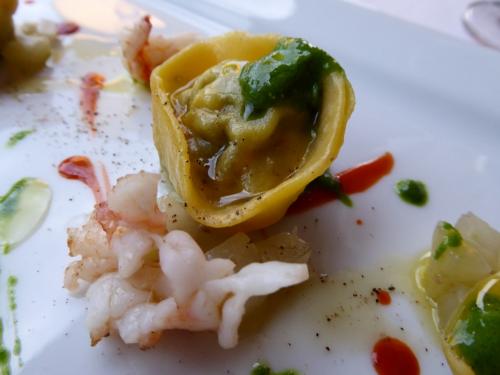 @パスタ:ホウレンソウとエビのラビオリ ホウレンソウソースと軽くグリルしたエビを添えて